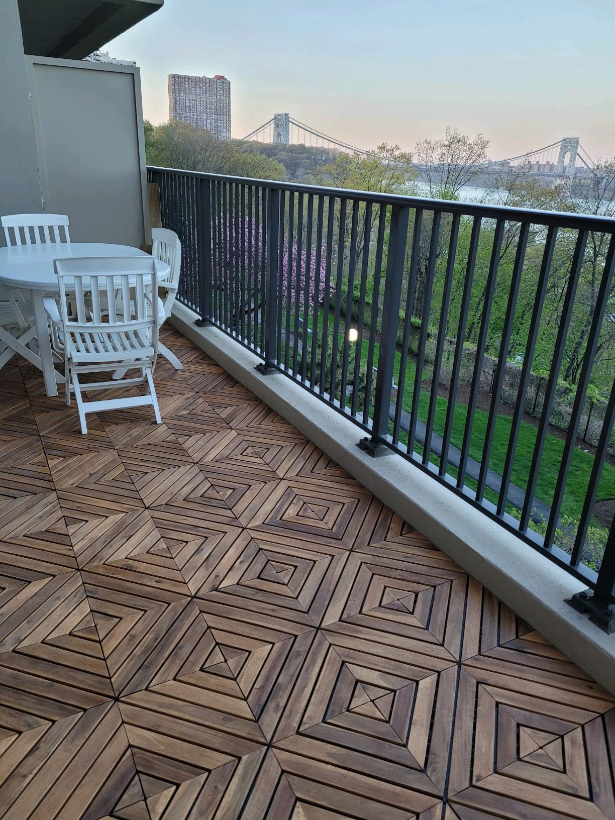 Sàn gỗ lót ban công 8 nan xéo là một trong những kiểu vỉ gỗ độc đáo nhất trong ngành. Khi lắp 4 vỉ cùng mới nhau sẽ giúp nơi lót trở nên vô cùng đẹp!