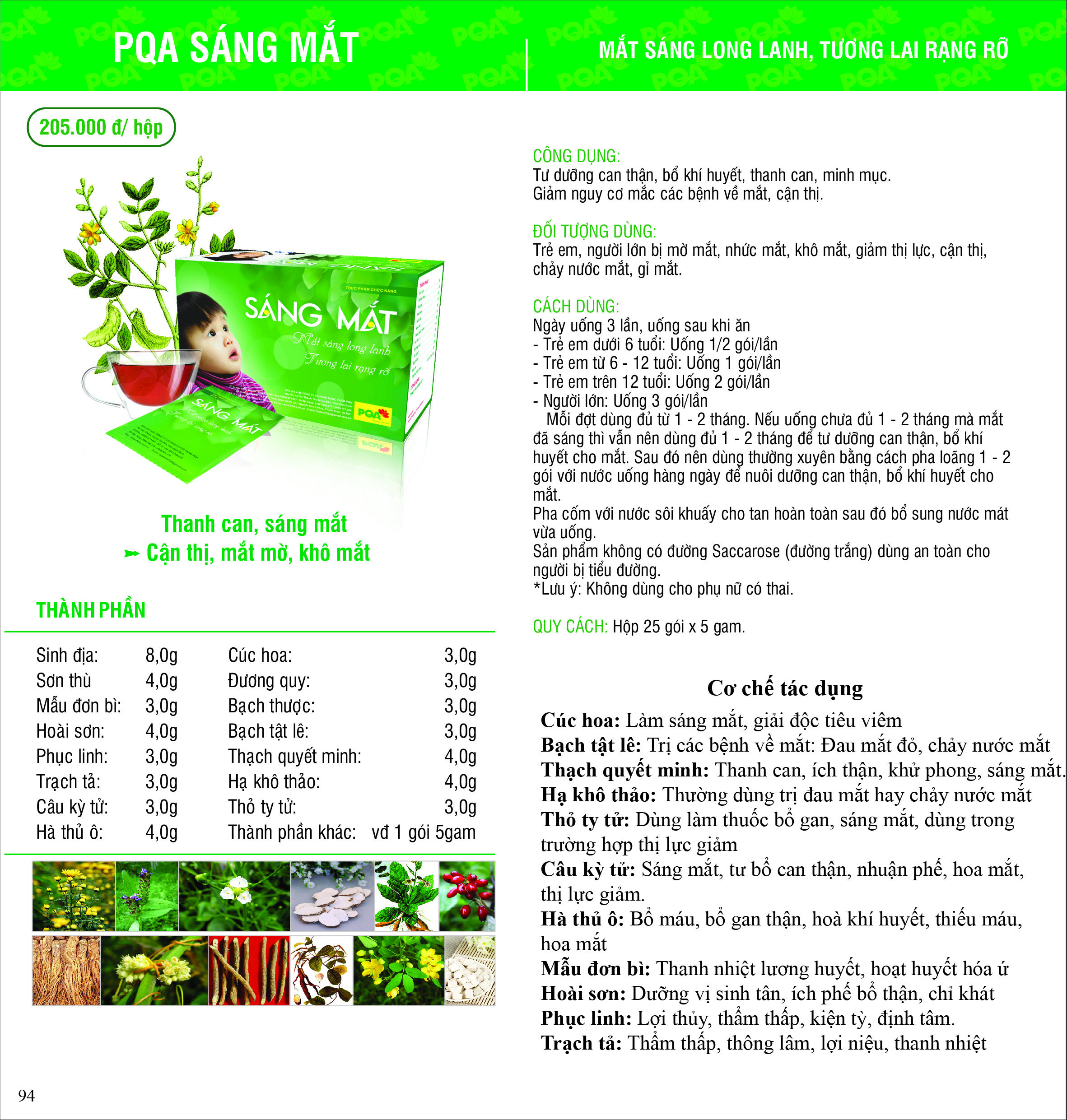 Sáng Mắt PQA Thành Phần Từ Thiên Nhiên Hỗ Trợ Bổ Cho Mắt, Cải Thiện Thị Lực Hộp 25 Gói THÔNG TIN SẢN PHẨM: - Xuất xứ: Việt Nam - Dung tích: Hộp 25 gói
