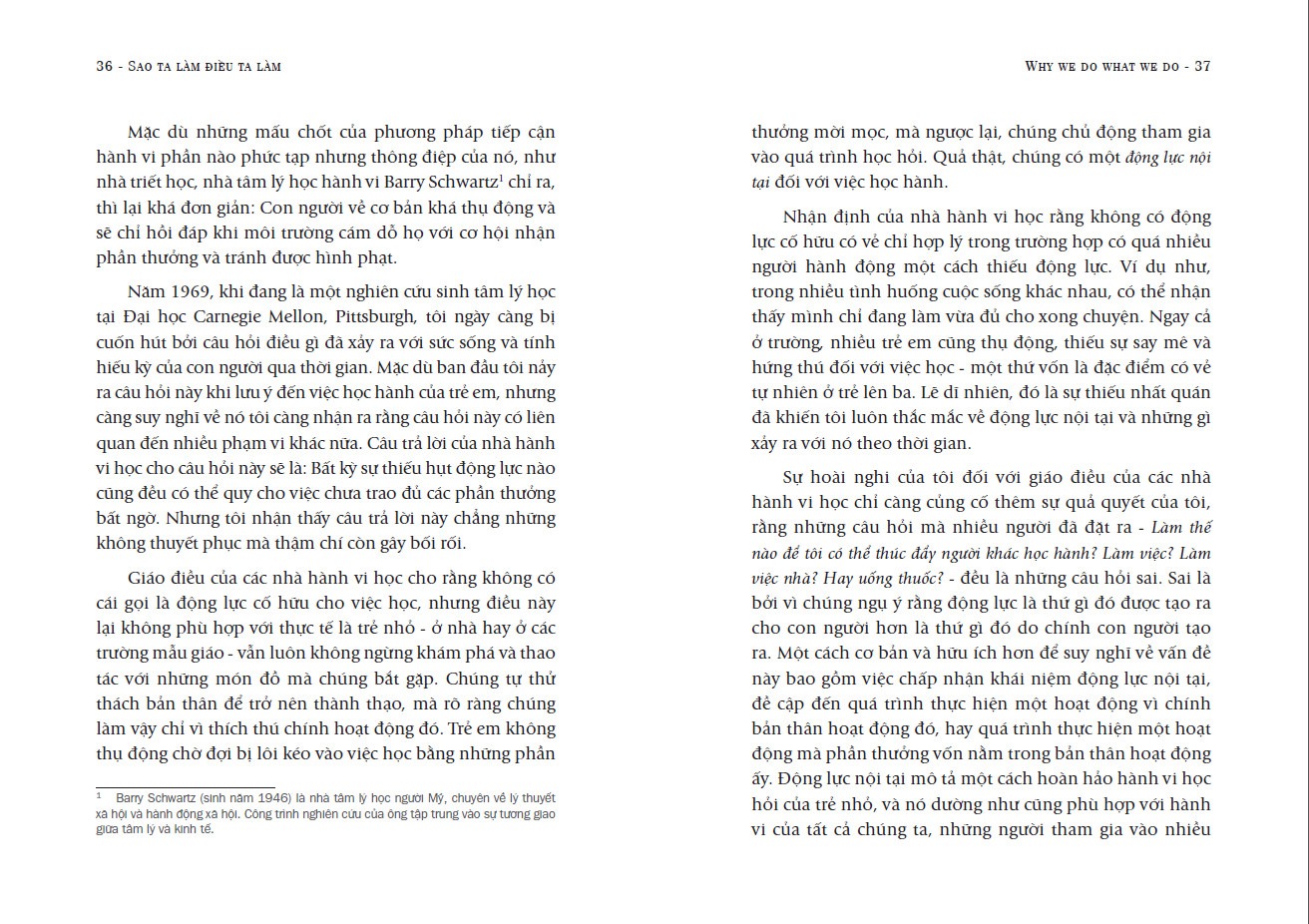Bắt nguồn từ trăn trở tương tự về việc tự chủ hay bị kiểm soát, Edward L. Deci cùng cộng sự của mình đặt ra câu hỏi: Tại sao trẻ em chào đời với thiên hướng khát khao học hỏi, chúng tò mò và hiếu kỳ với tất cả mọi thứ, thế nhưng tính hiếu kỳ và năng lực học hỏi này dần suy giảm khi bọn trẻ bước vào môi trường học đường? Bằng những nghiên cứu và quan sát của mình, Edward L. Deci đã cho ra đời quyển sách “Sao ta làm điều ta làm”, nhằm giúp giải quyết những trăn trở về động lực thúc đẩy hành vi con người thông qua các nghiên cứu về khía cạnh nền tảng của Tâm lý học hành vi: Động lực.