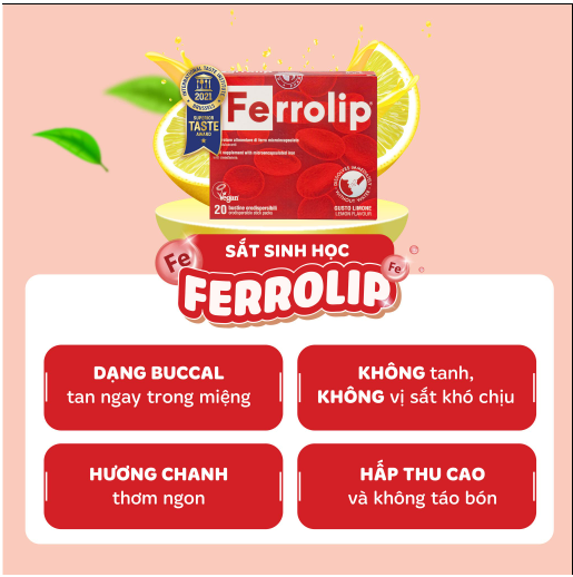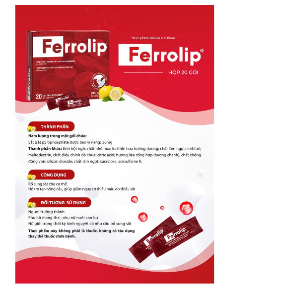 Ưu điểm của sản phẩm Ferrolip được sử dụng công nghệ bao phủ tinh vi, đưa sắt pyrophosphate vào các vi nang, lớp ngoài là liposome với ưu điểm: Sắt (III) pyrophosphat ít ảnh hưởng đến đường tiêu hóa và sinh khả dụng cao hơn sắt thông thường khác Sắt Liposome hấp thu cao gấp gần 4.7 lần sắt hữu cơ truyền thống. Hương vị ngon miệng hơn, dạng bột dễ phân tán, tan ngay với một lượng nước cực nhỏ. Không có các tác dụng không mong muốn như ợ chua, khó chịu đường tiêu hóa và táo bón. Nhập khẩu chính ngạch từ Italia. Website chính thức tại Việt Nam: Thành phần của sản phẩm Ferrolip Sắt bao màng liposome tương đương 30mg sắt nguyên tố Phụ liệu: tinh bột ngô, chất nhũ hóa: lecithin, chất điều chỉnh độ chua: axit citric; chất điều hương; chất ổn định: silicon dioxide; chất tạo ngọt: sorbitol, maltodextrin, sucralose, acesulfame K. Công dụng: Bổ sung sắt cho đối tượng thiếu máu, thiếu sắt. Đối tượng sử dụng Mọi người, đặc biệt phụ nữ trong độ tuổi sinh đẻ và thời kỳ mang thai. Cách sử dụng Sắt sinh học Ferrolip Nên uống một gói mỗi ngày, tốt nhất là ngay sau bữa ăn. Sử dụng trực tiếp không cần nước. Ferrolip có dạng bột có vị chanh dễ chịu, không dư vị kim loại. Dễ phân tán, tan ngay trong miệng mà không cần nước. Bảo quản: Bảo quản ở nhiệt độ không quá 25ºC; tránh tiếp xúc với nhiệt độ cao, ánh nắng mặt trời và tiếp xúc với nước. Để xa tầm tay của trẻ em dưới 3 tuổi. Hạn sử dụng 36 tháng kể từ ngày sản xuất. Quy cách bao gói Hộp 20 gói. Mỗi gói 30 gam Xuất xứ: Italy Thực phẩm này không phải là thuốc, không có tác dụng thay thế thuốc chữa bệnh
