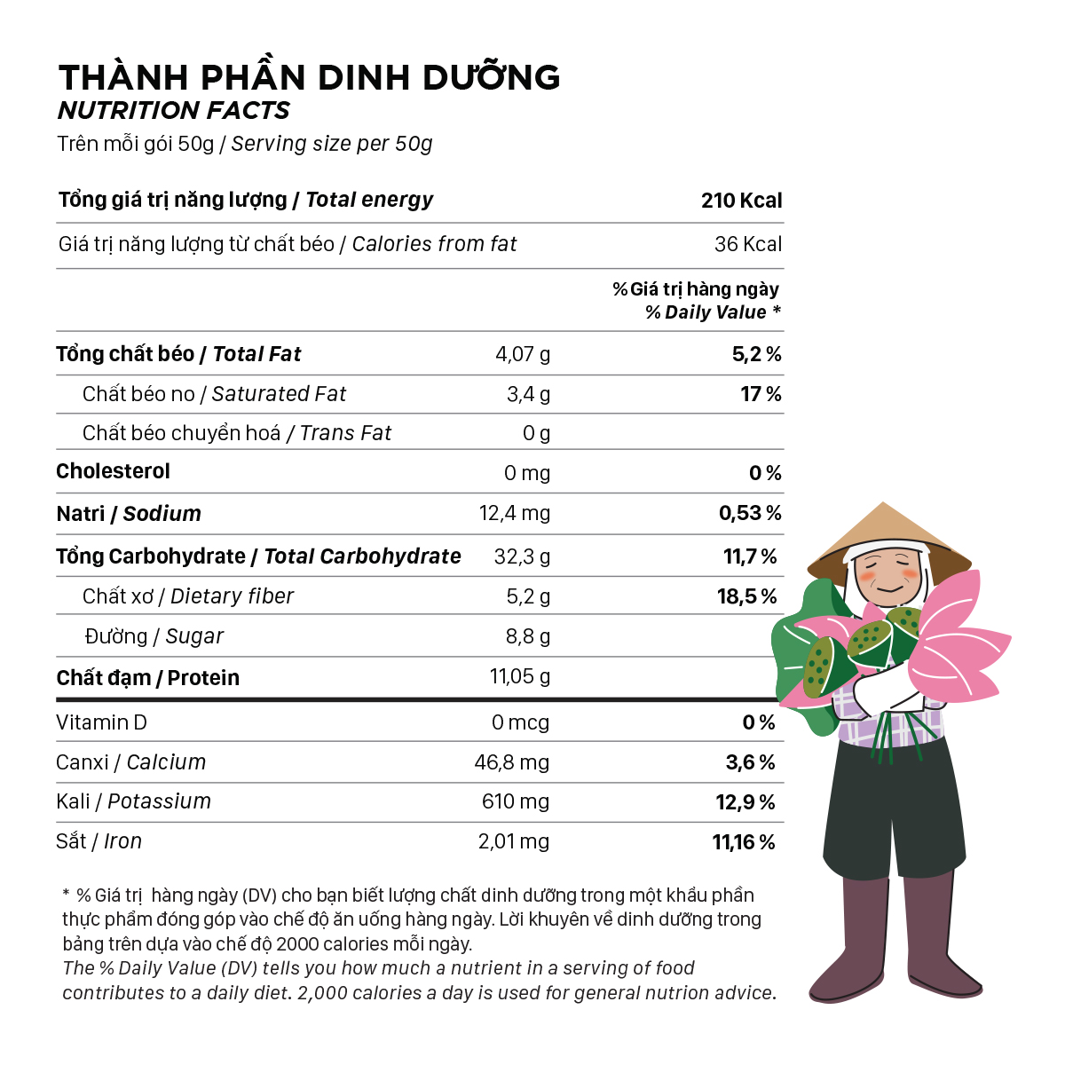 Với sản phẩm tươi sống, trọng lượng thực tế có thể chênh lệch khoảng 10%. GIÒN, NGON, BỔ, RẺ. HƯƠNG VỊ RẤT ĐẬM NÉT QUÊ HƯƠNG Thành phần: Gạo lức (94%), rong biển (2%), đường,