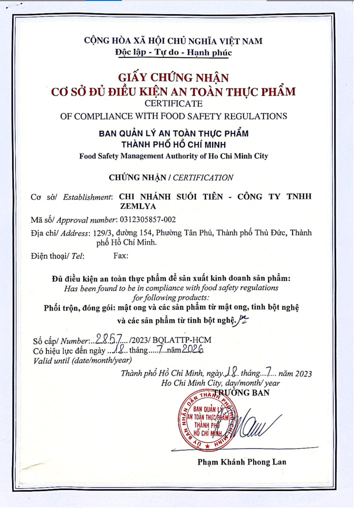 - Chứng nhận Vệ sinh an toàn thực phẩm số 103/2021/BQLATTPHCM do Ban quản lí An toàn thực phẩm TPHCM cấp ngày 08/01/2021