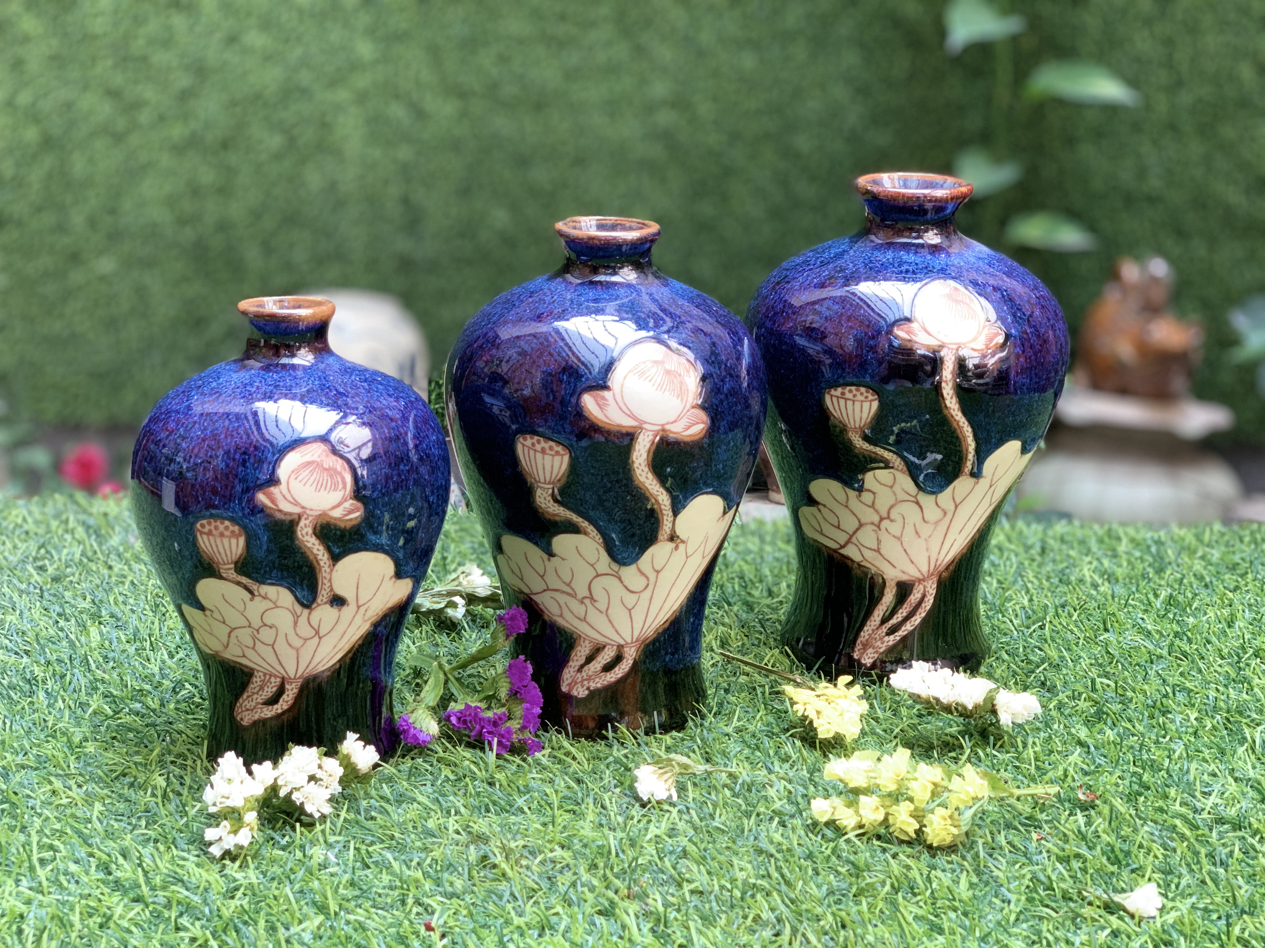 Bộ 3 bình hút tài lộc Men rạn cổ Bát Tràng Vẽ hoa tẩm tú cầu Dùng bầy , trang trí phòng khách , phòng giải trí của gia đình rất đẹp