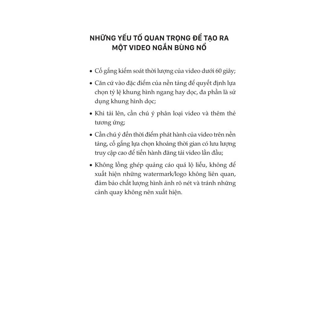 - Không lồng ghép quảng cáo quá lộ liễu, không để xuất hiện những watermark/logo không liên quan, đảm bảo chất lượng hình ảnh rõ nét và tránh những cảnh quay không nên xuất hiện. Các bước để xây dựng một kịch bản video ngắn triệu view Trong cuốn sách “Short videos : Kịch bản hay, triệu views tới tay”, tác giả chia sẻ các bước chi tiết, những kinh nghiệm và phương pháp để có được một kịch bản hoàn hảo. Tư duy sáng tạo kịch bản: Đừng vội đặt bút vì chúng ta dễ đi sai, việc viết kịch bản đòi hỏi phải có tư duy phóng khoáng, tự do, không gò bó, cần biết cách điều khiển tư duy linh hoạt để nó luôn hữu ích. Bạn cần sở hữu cho mình một số tư duy như định vị, liên kết… trong sáng tạo nội dung để chạm đến điểm đau thật sự khi nói đến nhu cầu của người dùng. Tiêu đề: Tiêu đề là điểm bắt đầu, là đại diện cho sự độc đáo, tiêu đề giúp thu hút sự chú ý, sàng lọc người dùng, dẫn dắt tương tác, tăng tốc. Trong cuốn sách, tác giả sẽ chia sẻ phương pháp viết tiêu đề và mẹo để tạo ra một tiêu đề bùng nổ. Mở đầu của kịch bản video: Việc kiểm soát thời gian là điều cốt yếu và ba giây đầu là thời điểm quan trọng, gọi là “3 giây vàng”. Ba giây này quyết định phần lớn số lượng người dùng mà một video có thể thu hút và giữ chân. Phần chính của video: Phần chính của video chính là yếu tố cốt lõi để khơi gợi sự cộng hưởng ở người dùng và được người dùng ghi nhớ, đem lại cho họ sự cộng hưởng cảm xúc, tác động các giá trị quan hoặc gợi hành động, suy nghĩ sâu sắc. Cuốn sách mang đến cách để video trở nên đáng nhớ. Phần kết: Phần kết là phần để biến lượng truy cập thành lượt chuyển đổi. Một phần kết không chỉ thỏa mãn người dùng, mang tới lượt yêu thích, chia sẻ bình luận mà còn lôi kéo được mọi người đến trang chủ của nhà sáng tạo, tăng lượt theo dõi và bán được hàng. Ngoài ra, trong cuốn sách “Short videos: Kịch bản hay, triệu view tới tay” tác giả còn chia sẻ cách để có được những câu vàng, làm điểm nhấn cho video hoặc mẹo viết kịch bản cho từng nền tảng mạng xã hội thường gặp, những lỗi thường có khi viết kịch bản video ngắn. Theo xu hướng thời đại, video ngắn trở thành một công cụ đắc lực cho các nhà sáng tạo nội dung, nếu nắm trong tay những kiến thức và điểm mấu chốt, nó sẽ giúp cho bạn đạt được điều mình muốn. Áp dụng những nội dung trong cuốn sách Short videos: Kịch bản hay, triệu view tới tay để có được video triệu view ngay bây giờ!