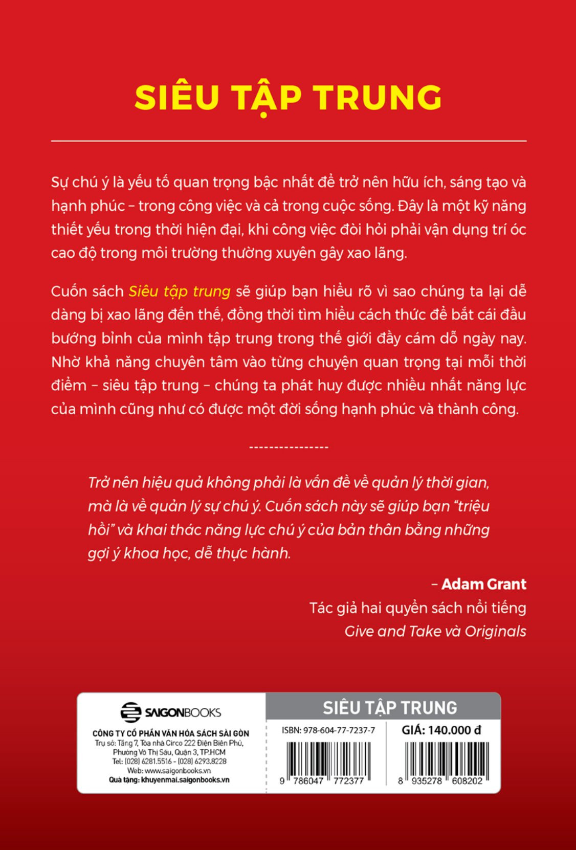 Qua lối trình bày sinh động, dễ hiểu, tác giả Chris Bailey viết về một chủ đề hết sức thiết thực: Sự hiệu quả. Trong thế giới ai ai cũng muốn vừa thành công trong sự nghiệp, vừa muốn xây dựng những thế hệ tiếp nối năng động va chất lượng, Siêu tập trung có một giải pháp tuyệt vời cho họ. Qua từng trang sách, bạn sẽ được tiết lộ về cách thức tập hợp sức mạnh tập trung để tạo ra thanh quả. Nếu chúng ta mong muốn thành công và hạnh phúc, chúng ta cần phải bắt đầu bằng cách tập trung vào những gì chúng ta định tập trung vào.