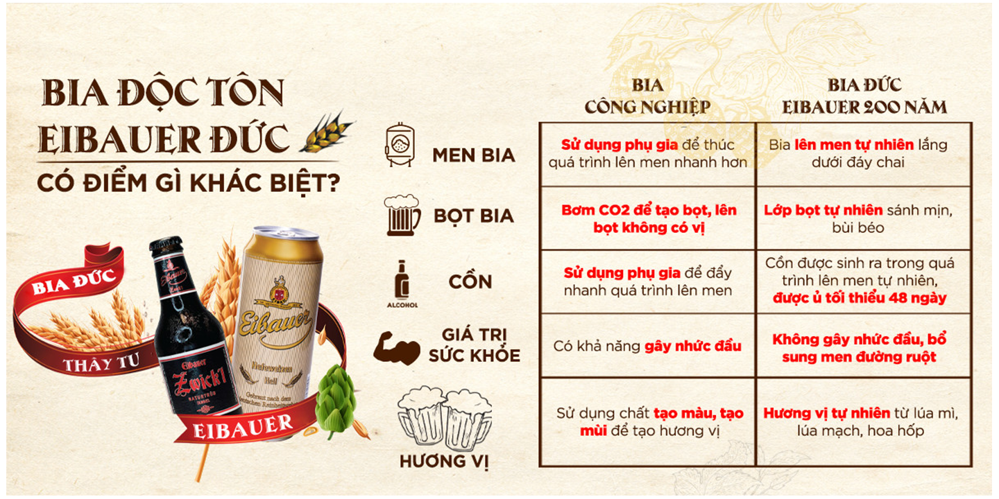 Mua tại Tiktok[SINCE 1810] Bia Đức Thầy Tu Eibauer Vàng 5.2 ĐỘ - Lên Men Tự Nhiên Thượng Hạng - Nhập Khẩu Chính Hãng Xuất xứ & Nơi sản xuất / Origin: Đức / Germany Nồng độ cồn / Alcohol content: 5.2% vol Màu sắc bia / Colour of beer: 13.6 EBC Độ đắng / Bitternes units: 15.3 BU Thành Phần : Hoa bia, mạch nha thơm, men bia sống, nước cất tinh khiết. HSD 18 tháng kể từ ngày sản xuất LỊCH SỬ BIA 200 NĂM: Năm 1810 nhà máy bia Eibauer đầu tiên được vua của Saxony – Frederick Augustus I (1806-1827), cho phép xây dựng theo công thức làm bia một vị thầy tu xứ Eibauer, người đam mê nghệ thuật ủ bia và sáng tạo ra chất bia với hương vị tuyệt đỉnh lừng danh hơn 200 năm. Bia Vàng Eibauer - 5.2% Vol : Dòng bia hoàn hảo để nuôi dưỡng cảm xúc, giải tỏa căng thẳng mệt mỏi, chỉ vài ngụm bia vàng thầy tu Eibauer cảm hứng lại tuôn trào, năng lượng lại dạt dào, nhẹ nhàng lâng lâng sảng khoái Chỉ cần so sánh với bất kỳ thức uống khác về độ cân bằng êm mượt, sự hấp dẫn của hương thơm tự nhiên, hậu vị mượt mà thuần khiết, bạn sẽ dễ dàng cảm nhận được đẳng cấp thượng hạng và hương vị tuyệt hảo của bia vàng Eibauer mà không có dòng bia nào có thể so sánh được. Vẻ đẹp thuần túy của một ly Eibauer vàng 5.2 vol. Ai đã thử thì khó lòng bỏ qua Màu sắc: sắc vàng sánh đậm đặc trưng Mùi thơm: Hương thơm mạch nha phảng phất dễ chịu bắt nguồn từ mạch nha và hoa bia vùng Hallertau. Vị : Eibauer thấm dần nhẹ nhàng qua từng ngụm khiến cho người uống ngỡ ngàng về độ mạnh mẽ một cách từ tốn, không phô trương nhưng đầy đẳng cấp. Ở những ngụm đầu tiên, một cảm giác tê nhẹ nơi đầu lưỡi, sự cân bằng mềm mại giữa vị ngọt của mạch nha và vị đắng thanh mát đặc trưng của hoa hops. Lớp bọt là các hạt mịn bồng bềnh, hài hòa trong dòng chảy sóng sánh. Bia Độc Tôn Eibauer Đức CÓ ĐIỂM GÌ KHÁC BIỆT? Men bia: Bia lên men tự nhiên lắng dưới đáy chai Bọt bia: Lớp bọt tự nhiên sánh mịn, bùi béo Cồn: Cồn được sinh ra trong quá trình lên men tự nhiên, được ủ tối thiểu 48 ngày Giá trị sức khỏe: Không gây nhức đầu, bổ sung men đường ruột Hương vị: Hương vị tự nhiên từ lúa mì, lúa mạch, hoa hốp Hướng dẫn bảo quản: Bảo quản ở nhiệt độ thường, nơi khô ráo, thoáng mát, tránh xa ánh nắng mặt trời. Bảo quản trong tủ lạnh nhiệt độ từ 9 đến 11 độ C cho có bia chất lượng bia tốt nhất. Hướng dẫn sử dụng: Bia ướp lạnh sâu, nhiệt độ lý tưởng là 10°C, màu bia sẽ chuyển từ vàng đỏ qua màu vàng chanh sóng sánh, hương quyện lại, vị đậm sâu là lúc bạn sẽ hiểu vì sao hương vị của nó lại lưu luyến lòng người đến thế. Lắc nhẹ đều lon/chai bia trước khi rót. – Không uống với đá, hương vị sẽ bị tàn phá vì nếu uống với đá, bia sẽ loãng ra, nhạt dần… rất khác với các loại bia ít hương vị, hay các loại bia sử dụng chất tạo hương, tạo vị