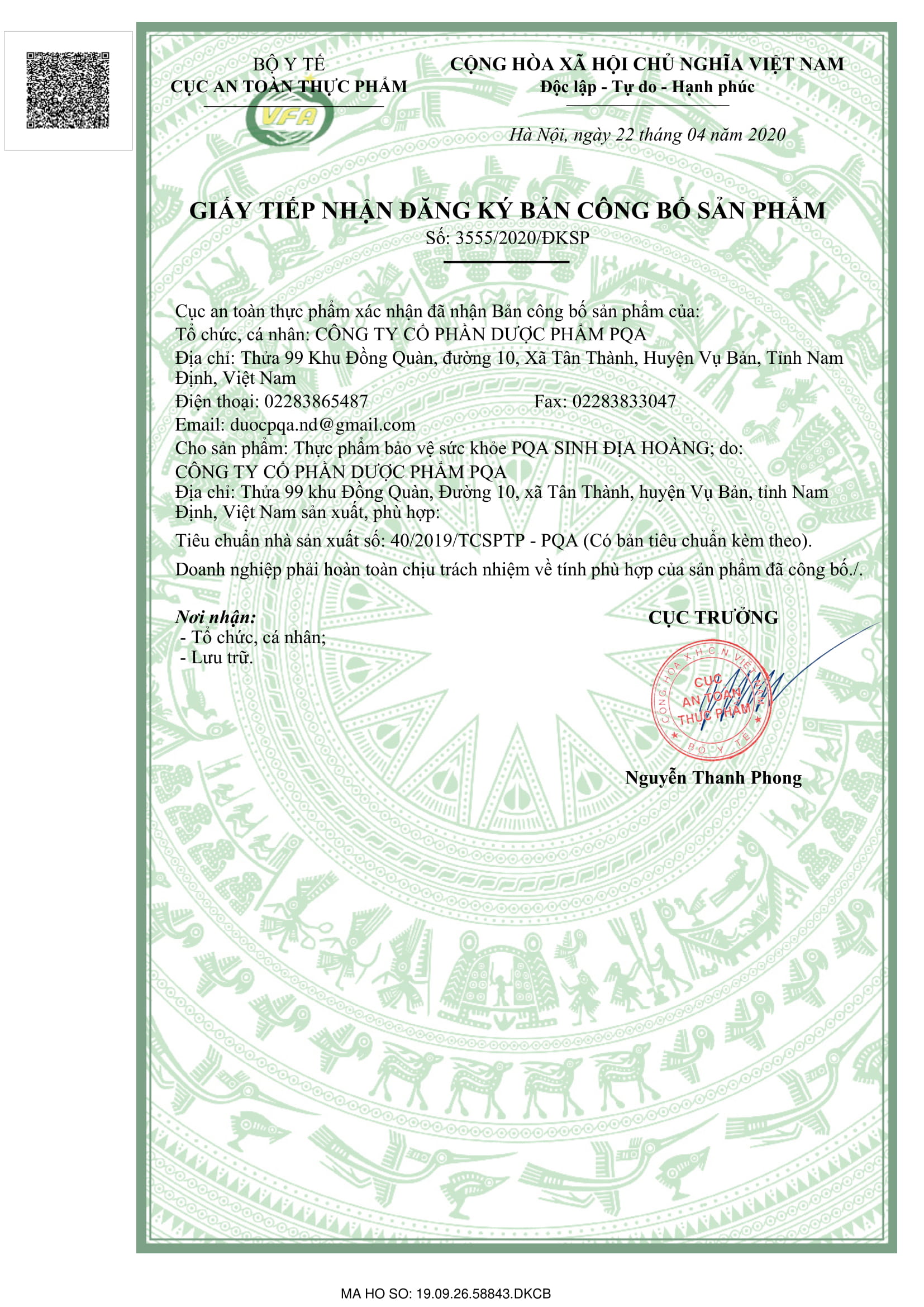 - Địa chỉ sản xuất: Công ty Cổ phần Dược phẩm PQA. Thửa 99, Khu Đồng Quàn, Xã Tân Thành, Huyện Vụ Bản, Tỉnh Nam Định. THÀNH PHẦN: