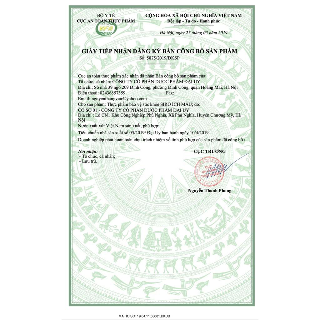 Mua tại TiktokCông dụng: Giúp điều hoà khí huyết, chỉ huyết, bổ huyết điều kinh Đối tượng sử dụng: Dùng cho nữ giới kinh nguyệt không đều, rong kinh, rối loạn kinh nguyệt, phụ nữ sau sinh Hướng dẫn sử dụng: Ngày uống 50ml chia 2 lần Thành phần: Ích mẫu: 160g Hương phụ: 40g Ngải cứu: 40g Phụ liệu vừa đủ Bảo quản nơi khô ráo, thoáng mát, tránh ánh nắng trực tiếp