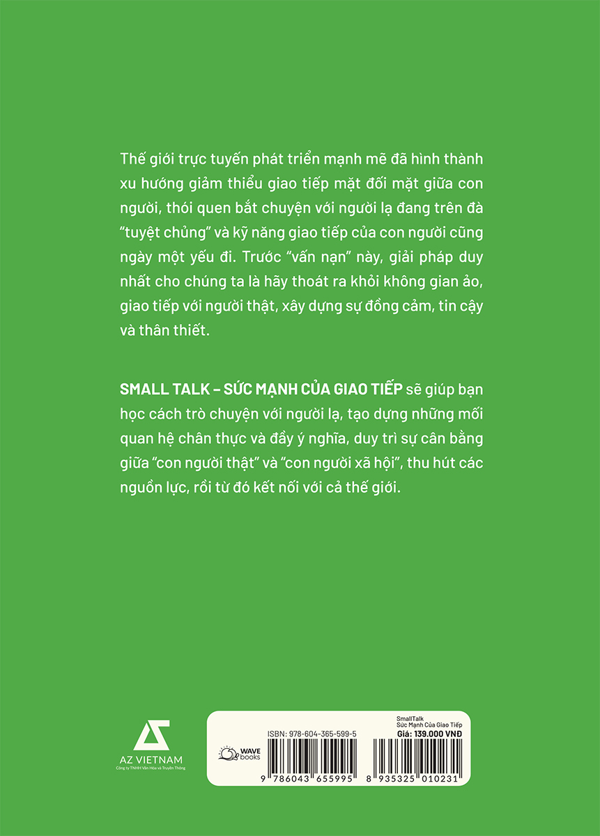Cuốn sách này sẽ cho bạn thấy rằng chúng ta hoàn toàn có thể loại bỏ những rắc rối do kỹ năng trò chuyện xã giao kém gây ra. Hãy để cuốn sách đồng hành với bạn mỗi ngày, bắt đầu bằng một câu gợi chuyện và sử dụng kỹ năng small talk để tạo ra nhiều kết nối có ý nghĩa hơn.