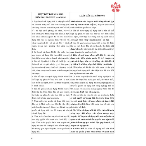 Trong cuốn sách này, Luật Đất đai năm 2024 và Luật Đất đai năm 2013 (sửa đổi, bổ sung năm 2018) sẽ được so sánh dưới hình thức lập bảng. Những nội dung mới, sửa đổi, bổ sung được thể hiện bằng chữ “nghiêng, đậm” để thuận tiện cho việc tra cứu, sử dụng và áp dụng pháp luật.