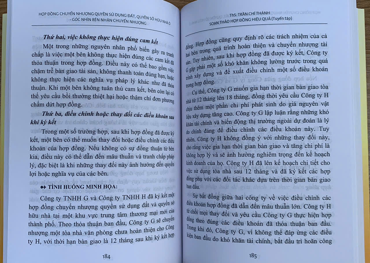 Trong bối cảnh thị trường bất động sản ngày càng phức tạp và biến động, việc chuyển nhượng quyền sử dụng đất và quyền sở hữu nhà ở luôn tiềm ẩn nhiều rủi ro pháp lý. Sự hiểu biết sâu sắc về các quy định pháp luật và khả năng soạn thảo hợp đồng chính xác là yếu tố then chốt để bảo vệ quyền lợi của các bên tham gia, đồng thời đảm bảo rằng giao dịch diễn ra suôn sẻ và hợp pháp. Một hợp đồng được soạn thảo kỹ lưỡng không chỉ là một công cụ pháp lý quan trọng mà còn là nền tảng để ngăn ngừa rủi ro và bảo vệ quyền lợi của người nhận chuyển nhượng. n sự mỗi nối thành sign tôn ba Cuốn sách này là một phần trong tuyển tập “Soạn thảo hợp đồng hiệu quả”, mỗi tập sẽ phân tích sâu về một loại hợp đồng cụ thể nhằm mang lại cho người đọc cái nhìn toàn diện và chi tiết nhất. Tập đầu tiên, với tiêu đề “Hợp đồng chuyển nhượng quyền sử dụng đất, quyền sở hữu nhà ở - góc nhìn bên nhận chuyển nhượng”, đi sâu vào việc nhận diện và phân tích các rủi ro pháp lý phổ biến trong quá trình chuyển nhượng. Thông qua việc cung cấp các giải pháp soạn thảo cụ thế, cuốn sách hướng đến việc giúp người đọc phòng ngừa rủi ro và bảo vệ quyền lợi của mình một cách hiệu quả.