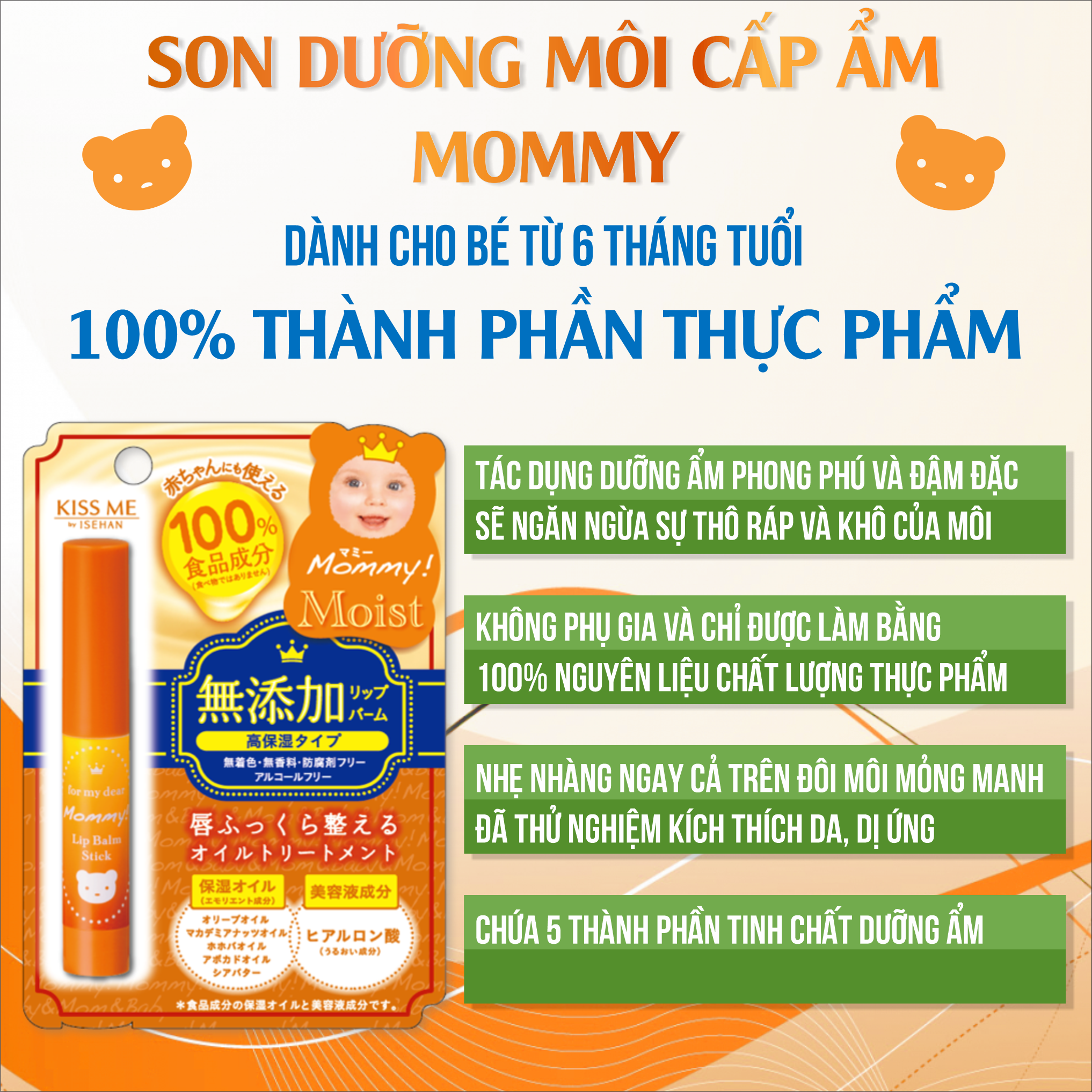 Kissme Mommy Son Dưỡng Môi Dành Cho Bé Từ 6 Tháng Tuổi (2.5g) Thông tin sản phẩm: Số Lô: In trên sản phẩm Thương hiệu: Kissme Xuất Xứ: Nhật Bản Khối lượng tịnh : 2.5g HSD: 5 năm kể từ ngày sản xuất   Son dưỡng với 100% thành phần từ nguyên liệu thực phẩm, không chất phụ gia, tạo độ an toàn, giúp da bé không bị kích ứng, không gây ra cảm giác châm chích khi sử dụng. Ngoài ra với tinh chất dưỡng ẩm từ :Dầu trái ô liu, Dầu hạt Macadamia, Dầu hạt Jojoba, Dầu bơ, Bơ hạt mỡ cung cấp lượng ẩm phong phú và đậm đặc ngăn ngừa sự thô ráp, nứt nẻ, bong tróc và khô môi của Bé. Đặc biệt Lõi Son siêu mịn, đầu vạt chéo dễ sử dụng tạo cảm giác nhẹ hàng trên môi Bé • Chuyên dụng cho Bé từ 06 tháng tuổi và những bạn có Làn da nhạy cảm. 1/ Công dụng:
