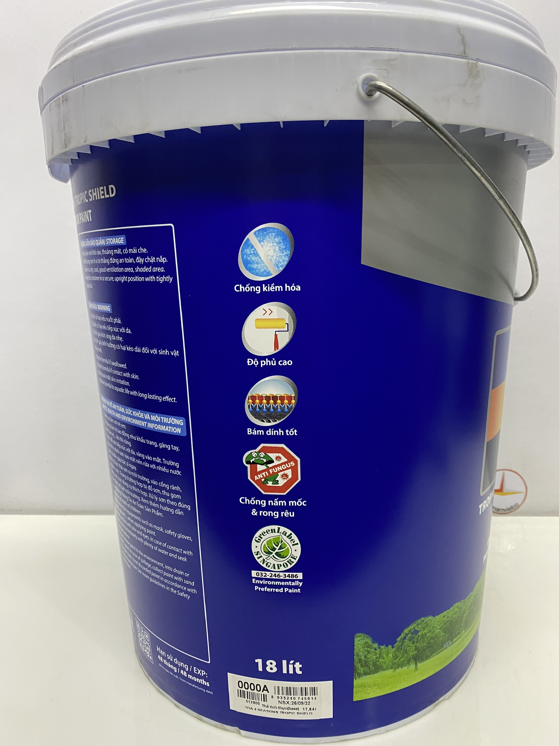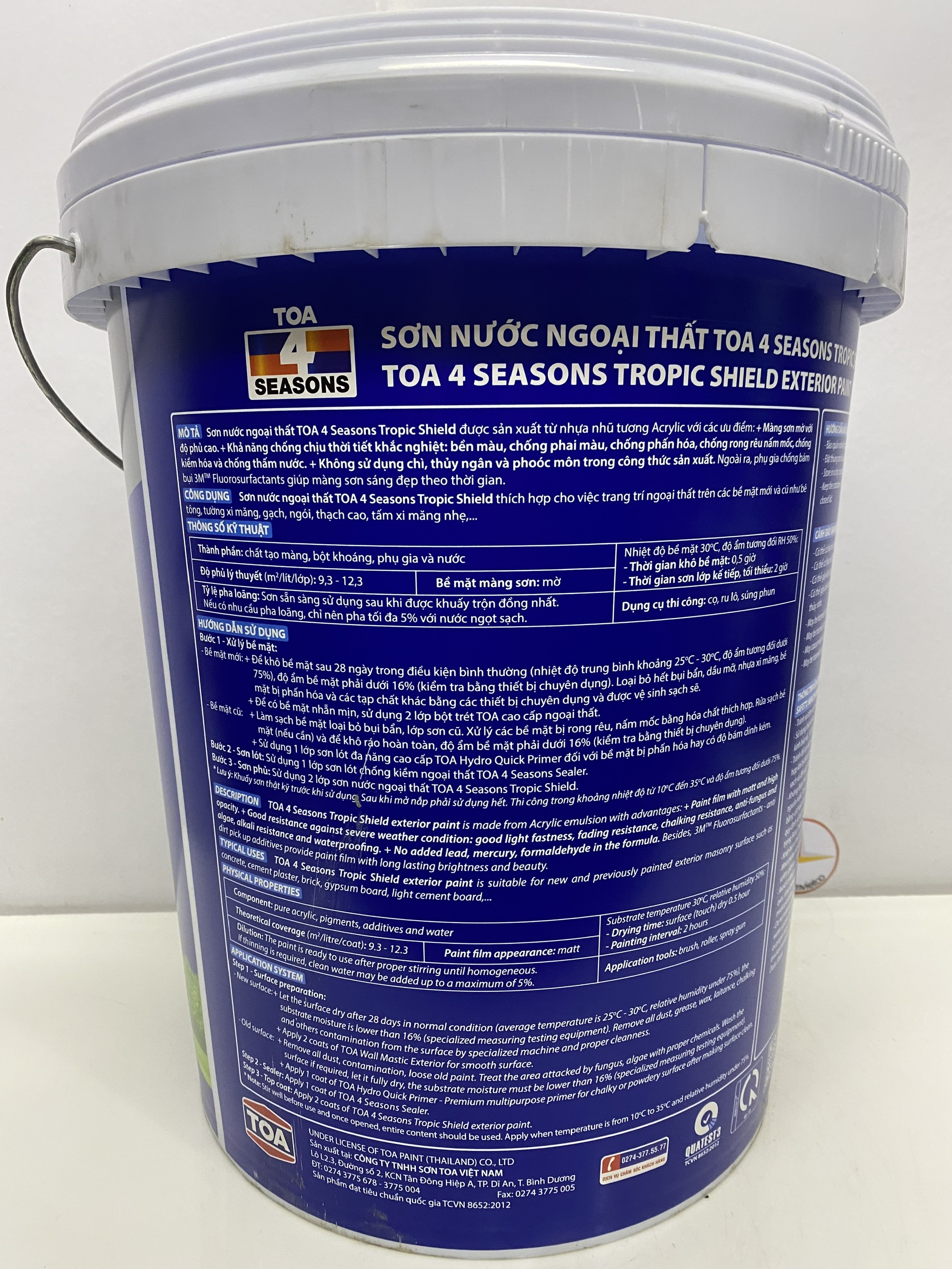 Chứng nhận Green label  MỤC ĐÍCH SỬ DỤNG: Sơn Nước Toangoại thất TOA 4 Seasons Tropic Shield thích hợp cho việc trang trí nội thất trên các bề mặt mới và cũ như bê tông, tường xi măng, bê tông, thạch cao, gạch, ngói, tấm xi măng nhẹ, v.v...  ĐẶC TÍNH SẢN PHẨM: · Thành phần cấu tạo: Chất tạo màng, Bột khoáng, Nước. · Màu sắc: Nhiều màu Theo bảng màu và quạt màu TOA · Bề mặt hoàn thiện: Mờ · Thể tích chất rắn: 37 ± 2 (% theo thể tích) · Độ phủ lý thuyết: 9 – 12 m2/lít/lớp Độ phủ thực tế sẽ phụ thuộc vào khả năng dàn trải của màng sơn, độ dày màng sơn khô, bề mặt thi công, tay nghề thợ sơn và lượng sơn hao hụt thực tế khi thi công. ·Hàm lượng chất hữu cơ bay hơi (VOCs): ≤ 50 g/l  Thời gian khô ở nhiệt độ 30 oC: khô bề mặt 30 phút ; khô cứng:4h  Đóng gói: 18 lít; 5 lít, 1lít Dụng cụ: Cọ, ru-lô/con lăn, súng phun sơn thông thường Tỷ lệ pha loãng:Sơn sẵn sàng sử dụng sau khi được khuấy trộn đồng nhất. Nếu có nhu cầu pha loãng, chỉ nên pha tối đa 5% với nước ngọt sạch. HƯỚNG DẪN THI CÔNG: Bước 1:  Xử lý bề mặt: Bề mặt mới: