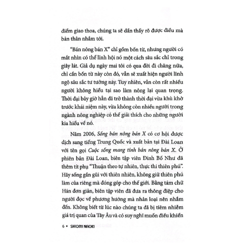 Sống bán nông bán X là nửa ngày làm nông, nửa ngày làm công việc X bạn yêu thích và có khả năng. Lối sống này vừa cho phép bạn đảm bảo đủ lương thực cơ bản cho gia đình, vừa có thời gian làm công việc mình thích. Tác giả Shiomi chỉ ra rằng, chúng ta không cần phải về quê hay có một mảnh vườn thật rộng mới có thể làm nông được. Bạn có thể làm nông ngay khi bạn đang ở trong lòng đô thị. Trong quá trình làm nông, tác giả tin rằng, bạn sẽ tìm ra nhân tố X của mình.