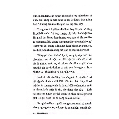 “Trong một thế giới mà khí hậu thay đổi, dân số tăng lên, thì đất nước có tỷ lệ tự cung tự cấp thấp như Nhật Bản lấy gì mà ăn. Trong thời đại như vậy, ngay cả khi có tiền đi chăng nữa, liệu chúng ta có mua được thức ăn không? Thêm vào đó, chúng ta lại định dùng các giá trị quan cũ, xòe tiền ra và chiếm dụng hết toàn bộ thức ăn hay sao?” Từ chính những suy tư này, tác giả Naoki Shiomi đã khởi xướng lối sống bán nông bán X - nông dân nửa ngày - từ giữa những năm 1990.
