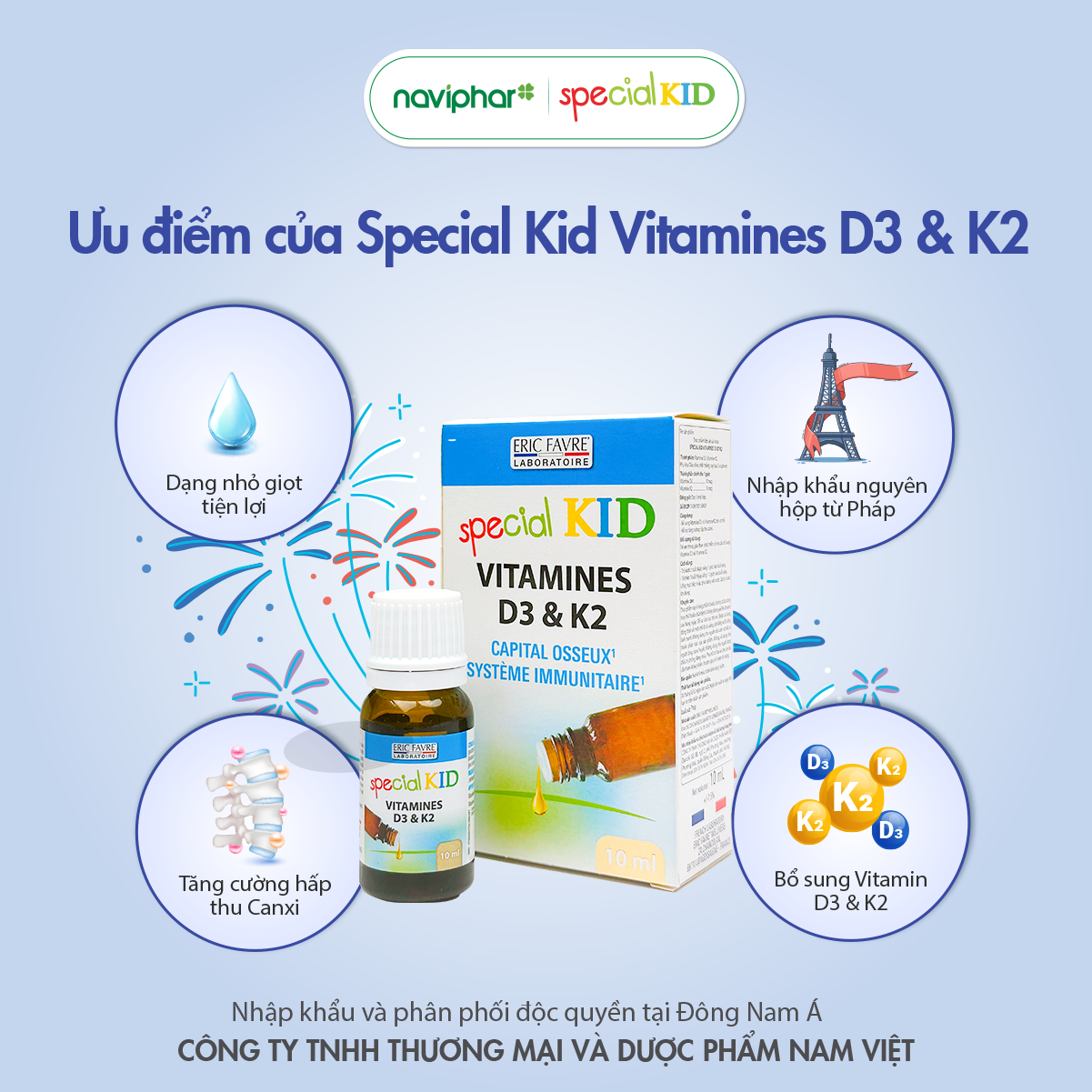 Special Kid là thương hiệu nhập khẩu nguyên hộp từ Pháp, đáp ứng hầu hết nhu cầu phòng và hỗ trợ điều trị các bệnh thường gặp của trẻ trong những năm tháng đầu đời. Special Kid Vitamines D3 et K2 được bào chế chuyên biệt dành cho trẻ em, mùi vị dễ chịu, chỉ cần sử dụng 1 lần/ngày. Tiết kiệm. Dễ nhớ
