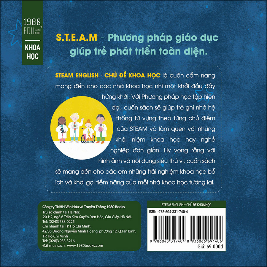 STEAM ENGLISH – CHỦ ĐỀ KHOA HỌC là cuốn cẩm nang mang đến cho các nhà khoa học nhí một khởi đầu đầy hứng khởi. Với phương pháp học hiện đại cuốn sách sẽ giúp trẻ ghi nhớ hệ thống từ vựng theo từng chủ điểm của STEAM và làm quen với những khái niệm khoa học hay nghề nghiệp đơn giản. Hy vọng rằng với hình ảnh và nội dung siêu thú vị, cuốn sách sẽ giúp các em có được những trải nghiệm khoa học ích và khơi gợi tiềm năng của những nhà khoa học tương lai.