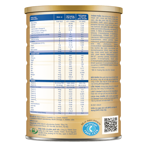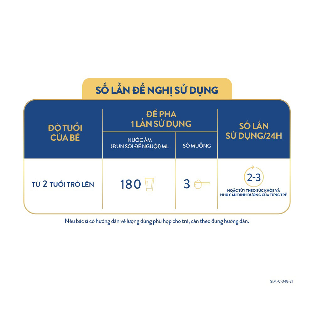 - Sản phẩm giàu canxi và hệ chất béo đặc biệt không chứa dầu cọ giúp hấp thụ canxi và DHA, hỗ trợ phát triển xương và tăng chiều cao. Thành phần dinh dưỡng Sữa không béo, lactose, DẦU THỰC VẬT (chứa: dầu hướng dương giàu oleic, dầu đậu nành, dầu dừa), đạm whey cô đặc, bột bơ sữa, KHOÁNG CHẤT (kali citrat, canxi carbonat, magiê clorid, kali hydroxit, sắt sulfat, natri clorid, kẽm sulfat, đồng sulfat, canxi clorid, tricanxi phosphat, mangan sulfat, kali iodid, natri selenat), đạm whey thủy phân, 5 HMOs (2'-fucosyllactose, lacto-N-tetraose, 3- fucosyllactose, 6'-sialyllactose, 3'-sialyllactose), acid arachidonic (AA), VITAMIN (acid ascorbic, RRR-α- tocopheryl acetat◊, niacinamid, canxi d-pantothenat, retinyl palmitat, thiamin hydroclorid, pyridoxin hydroclorid, riboflavin, acid folic, phylloquinon, d-biotin, cholecalciferol, cyanocobalamin), chất nhũ hóa lecithin đậu nành, acid docosahexaenoic (DHA), cholin bitartrat, NUCLEOTIDES (cytidin 5'-monophosphat, dinatri guanosin 5'- monophosphat, dinatri uridin 5'-monophosphat, adenosin 5'-monophosphat), cholin clorid, taurin, L-tryptophan, myo-inositol, ascorbyl palmitat, Bifidobacterium lactis BB- 12, hỗn hợp tocopherol, L- carnitin, CAROTENOID (lutein, β- caroten) ◊ Vitamin E tự nhiên BB-12: thương hiệu của Chr. Hansen Đối tượng sử dụng Dành cho bé từ 2 -6 tuổi Hướng dẫn sử dụng