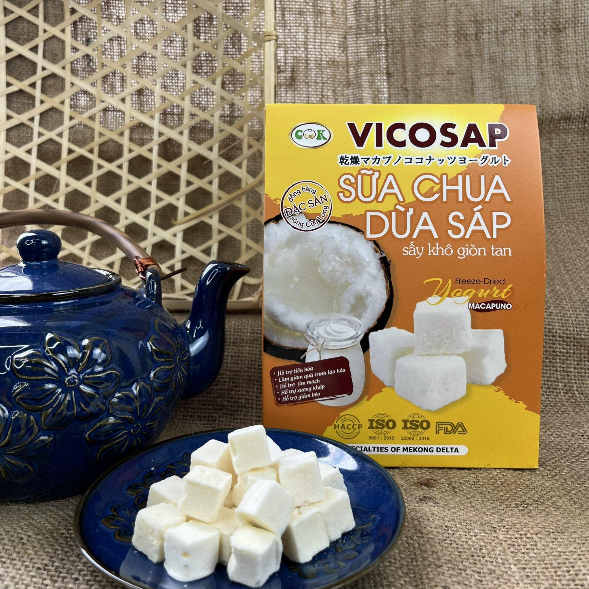 - Sản phẩm sữa chua dừa sáp sấy khô giòn tan Vicosap là sản phẩm sữa chua chế biến từ quả dừa sáp lần đầu có mặt tại Việt Nam.