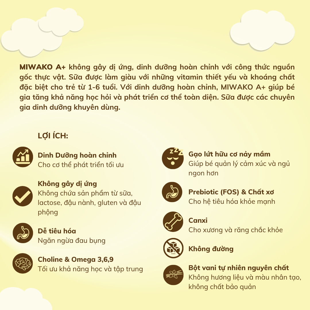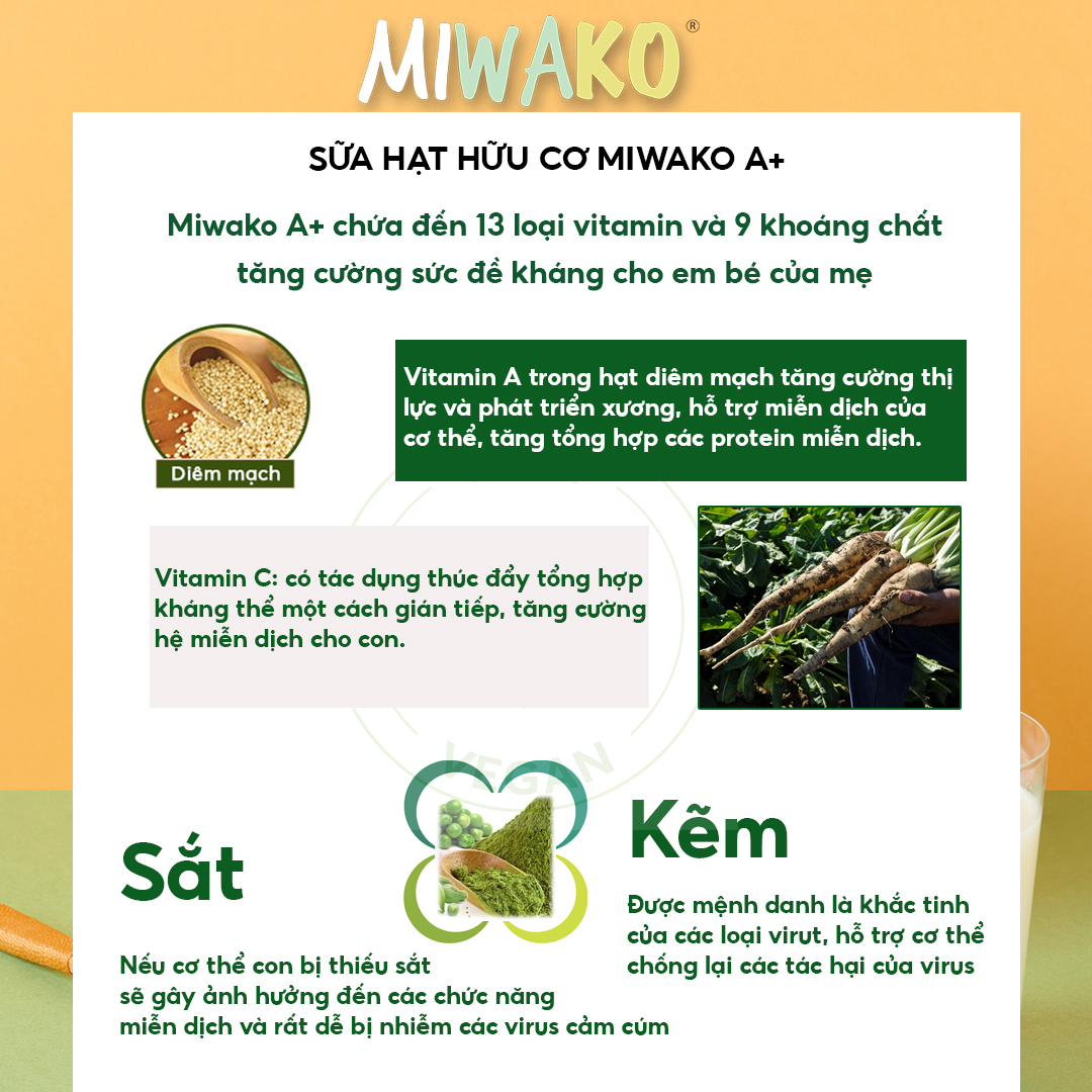 - Miwako A+ chứa đến 13 loại vitamin và 9 khoáng chất hỗ trợ tăng trưởng và phát triển cho bé