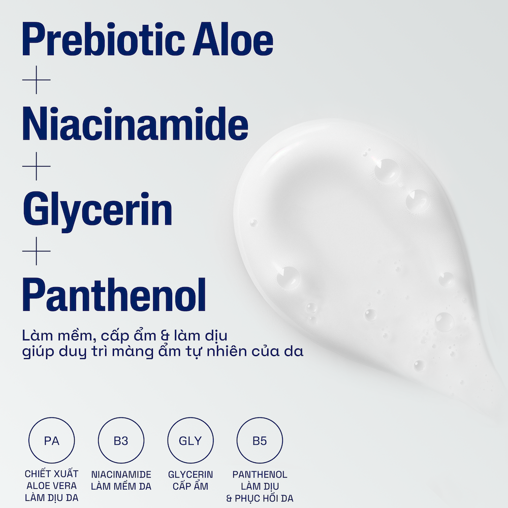 - Panthenol (B5) giúp làm dịu và phục hồi làn da • Với sự kết hợp 3 hoạt chất lành tính Niacinamide (Vitamin B3), Panthenol (Pro-vitamin B5) và Glycerin giúp kích thích da sản sinh 15 Ceramides tự nhiên giúp cải thiện khả năng phục hồi của làn da nhạy cảm. • Thành phần tạo bọt mịn từ Amino Acid giúp làm sạch một cách hiệu quả nhưng vẫn đảm bảo độ an toàn cho làn da nhạy cảm. • Độ pH lý tưởng 5.0 mang lại cho làn da cảm giác ẩm mịn sau khi làm sạch. •98% người tiêu dùng cho biết sản phẩm làm sạch da dịu nhẹ và lành tính. Sản phẩm nổi bật với 5 KHÔNG: Không xà phòng, không paraben, không sulfate, không hương liệu, không dầu khoáng an toàn cho làn da nhạy cảm. • Bác sĩ da liễu đã thử nghiệm và chứng minh lâm sàng là dịu lành cho da nhạy cảm HƯỚNG DẪN SỬ DỤNG