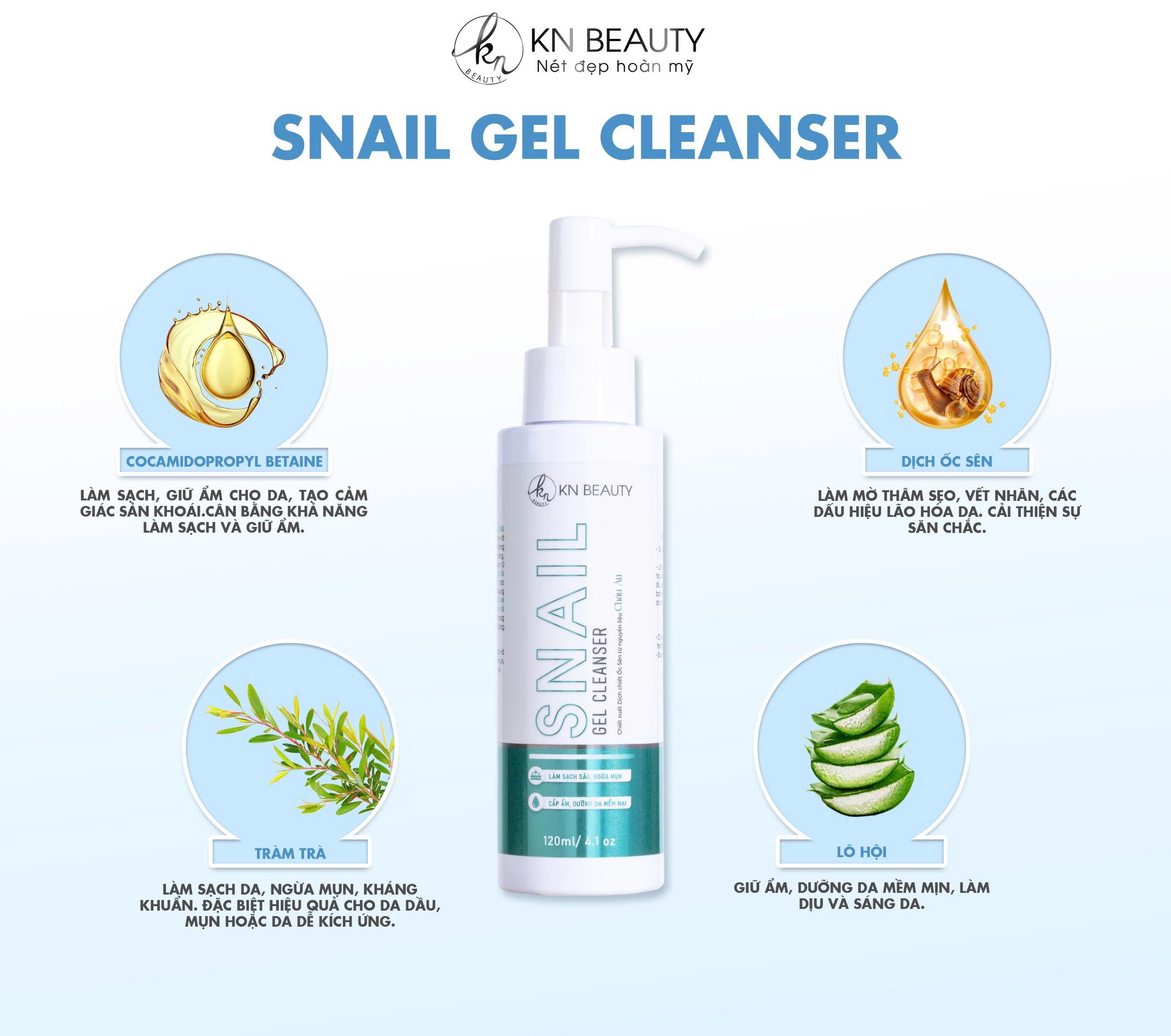 Gel Rửa Mặt Trắng Da Ngừa Mụn KN Beauty SNAIL GEL CLEANSER 120ml Gel rửa mặt KN Beauty SNAIL GEL CLEANSER giúp làm sạch nhờn và chất bẩn nhờ bọt mịn nhẹ nhàng len lỏi trong từng lỗ chân lông. Nguồn dưỡng chất tự nhiên dịch chiết ốc sên đến từ Châu Âu giúp da trở nên trẻ trung và săn chắc, thành phần lô hội dưỡng ẩm vượt trội và tràm trà ngăn ngừa mụn hiệu quả mang đến làn da mịn màng, trắng sáng. CÔNG DỤNG: Gel rửa mặt Sáng Da Snail Gel Cleaner KN Beauty 120ML là sản phẩm chăm sóc da hiệu quả trong việc làm sạch và cải thiện làn da.