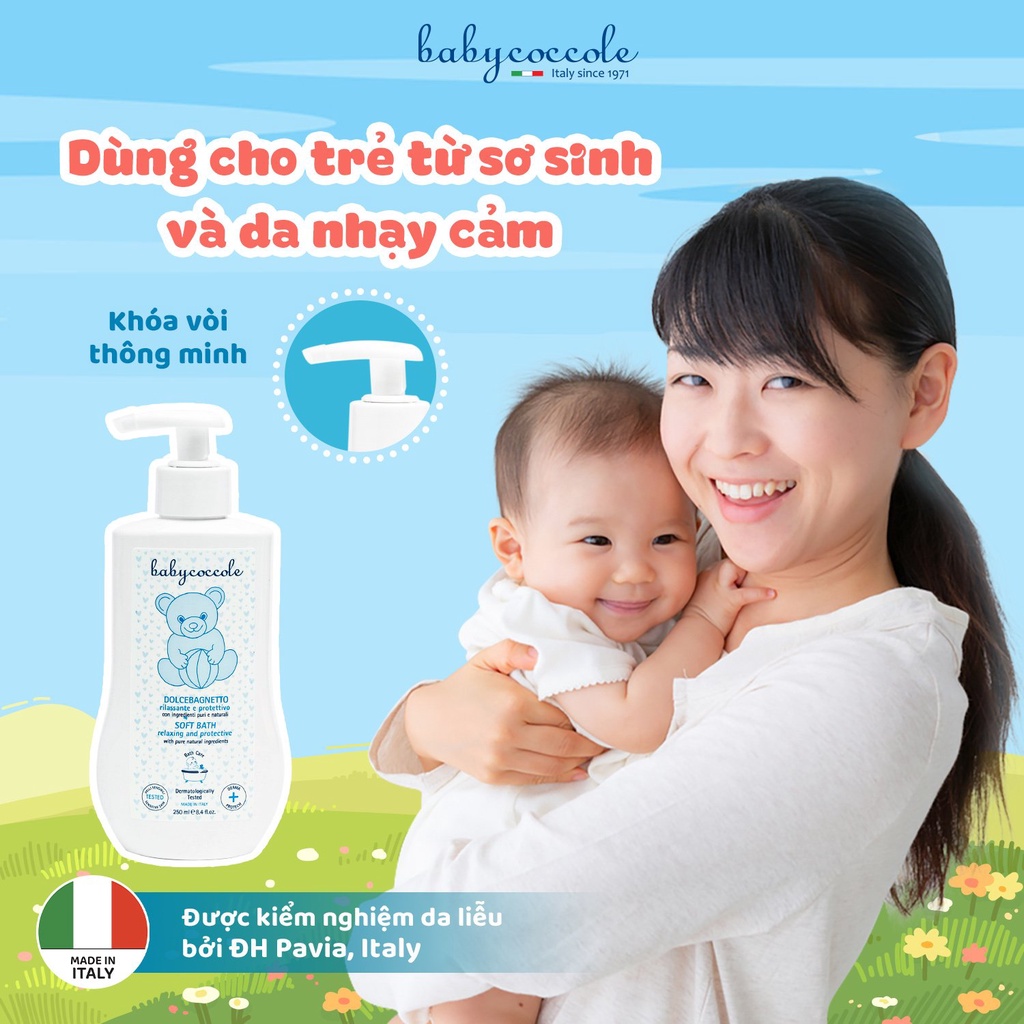 Sữa tắm giữ ẩm cho bé Babycoccole 0M+ chiết xuất hoa sen Giới thiệu BABYCOCCOLE - Sữa tắm giữ ẩm chiết xuất hoa sen - Một lựa chọn lý tưởng để giữ ẩm và làm mềm da, tạo cảm giác dễ chịu và thư giãn với mùi thơm dịu nhẹ của nước Italy. Sự tiện dụng của khóa vòi thông minh cùng bé trong mọi hành trình du lịch. Được 85.3% gia đình tại Ý tin dùng trong suốt 50 năm qua. Tất cả thành phần nguyên liệu đều được lựa chọn từ các nông trại canh tác hữu cơ hàng đầu của thế giới, từ đó mang đến những sản phẩm có nguồn gốc từ thiên nhiên, mang đậm mùi hương nước Ý. Công ty đã liên kết nhiều năm với Đại học Pavia, được xem như “Đại học Oxford” của Ý. Tất cả các sản phẩm của chúng tôi đều vượt qua 21 bài kiểm tra về da nhạy cảm và đạt được công thức dành riêng cho da nhạy cảm, bằng cách chắt lọc các thành phần tự nhiên hữu cơ. Thành phần Beta-glucan từ yến mạch kết hợp cùng Bisabolol từ hoa cúc giúp thư giãn, làm dịu da, giảm rôm sảy cho bé. Chiết xuất hoa sen: tạo hương thơm dịu nhẹ làm sạch da, mượt tóc và mang lại sự mềm mịn cho da bé. Glycerin duy trì độ ẩm, làm mềm mại da. Khác với Sữa tắm gội, Dầu gội: Sữa tắm giữ ẩm còn bổ sung thêm thành phần vitamin F từ hạt lanh. Mỗi loại vitamin luôn được biết đến với công dụng tăng cường sức khỏe cho da như: Vitamin E giữ ẩm da, Vitamin C cho làn da sáng khỏe còn theo Christopher Caires, nhà khoa học nghiên cứu tại Perricone, Vitamin F tạo ra một hàng rào tối ưu bảo vệ da bé, đặc biệt là da nhạy cảm, da khô ở trẻ sơ sinh và trẻ nhỏ. Đặc điểm nổi bật An toàn tuyệt đối cho trẻ sơ sinh: Không chất tạo màu và không chất hoạt động bề mặt như SLS-SLES*, không Parabens; Không có thành phần chiết xuất từ động vật; Thân thiện với môi trường; Đã được kiểm nghiệm da liễu và vi sinh; An toàn cho trẻ sơ sinh và trẻ nhỏ. Công thức No Tears – Không cay mắt: Cho bé thêm nhiều trải nghiệm thú vị, ngọt ngào. Giảm rôm sảy, giữ ẩm cho da: Nhờ sự đột phá của công thức Derma protech đặc biệt dành cho trẻ sơ sinh, tăng khả năng cung cấp độ ẩm và tính hiệu quả của các thành phần tự nhiên. Sữa tắm giữ ẩm chiết xuất hoa sen Babycoccole 0M+: Một lựa chọn lý tưởng để giữ ẩm và làm mềm da, tạo cảm giác dễ chịu và thư giãn với mùi thơm dịu nhẹ của nước Italy. Sự tiện dụng của khóa vòi thông minh cùng bé trong mọi hành trình du lịch. Sản phẩm đã được kiểm nghiệm an toàn với da nhạy cảm. Tại Việt Nam, sản phẩm đã được Bộ Y tế cấp giấy phép lưu hành số 116452/19/CBMP-QLD. Sữa tắm dịu nhẹ có màu trắng sữa. Công dụng Làm sạch cơ thể. Hướng dẫn sử dụng Sử dụng hòa tan trong nước hoặc thoa trực tiếp lên da. Công thức dịu nhẹ phù hợp sử dụng mỗi ngày.  Nên giữ thời điểm tắm bé vào cùng một thời điểm mỗi ngày, tốt nhất trước bữa ăn hoặc sau ăn ít nhất hai tiếng.  Nhiệt độ của nước không bao giờ vượt quá nhiệt độ cơ thể bình thường của bé (36,5 ° C - 98 ° F). Sản phẩm phù hợp với trẻ từ sơ sinh. Hướng dẫn bảo quản Bảo quản thoáng mát, tránh nơi có nhiệt độ cao hoặc tiếp xúc trực tiếp với ánh nắng mặt trời. Đậy kín nắp sau khi sử dụng. Khuyến cáo Không sử dụng sản phẩm quá hạn