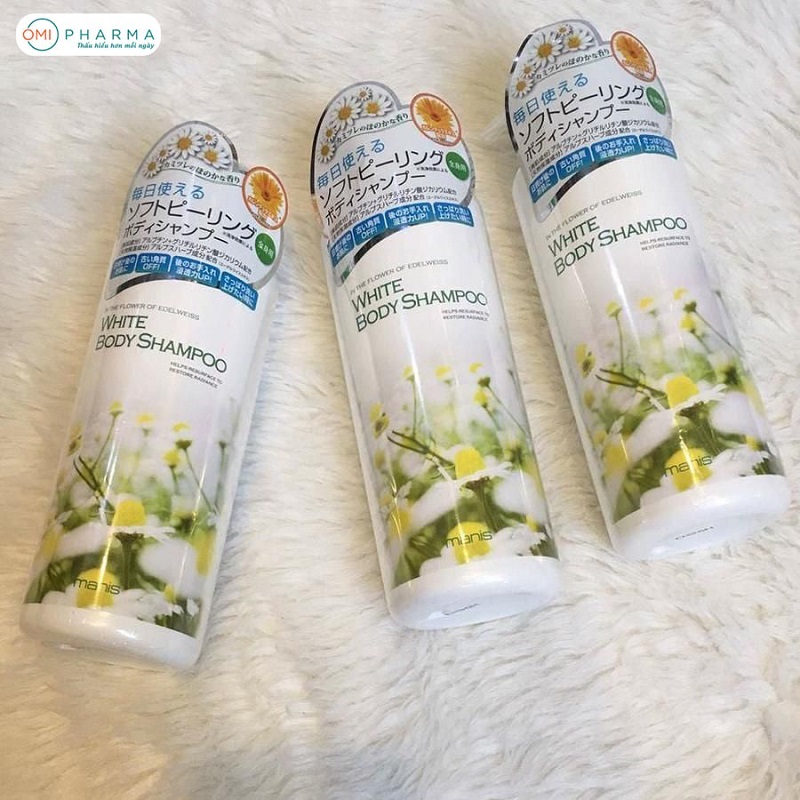• Với hương thơm dịu nhẹ từ hoa nhung tuyết, White Body Shampoo Manis giúp tinh thần thư giãn, thoải mái sau những giờ làm việc, học tập căng thẳng. Bạn sẽ có cảm giác như đang được chăm sóc da tại các Spa chuyên nghiệp. DƯỠNG TRẮNG TẠI NHÀ - TỰ TIN TOẢ SÁNG - QUẨY TUNG NẮNG HÈ Một mùa hè nữa sắp sang và làn da đem sạm, xỉn màu khiến các nàng không thể tự tin diện bikini đi biển, váy 2 dây giữa nắng hè? Vậy thì còn băn khoăn gì nữa mà không cùng Omi Pharma trang bị ngay 1 "trợ thủ" giúp dưỡng trắng tại nhà ngay từ bây giờ với Sữa tắm trắng da Manis hương hoa cúc Nhật Bản. Sữa tắm trắng da Manis hương hoa cúc Nhật Bản có dung tích 450ml Nổi tiếng tại quê nhà là sản phẩm sữa tắm trắng cực kì an toàn, lành tính, Sữa tắm Manis hương hoa cúc đã được các cơ quan y tế Nhật Bản chứng nhận về chất lượng và an toàn đối với làn da nên các cô gái có thể hoàn toàn yên tâm khi sử dụng.
