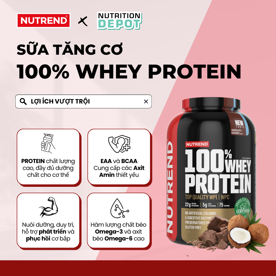 - Được nhập khẩu và phân phối độc quyền bởi Nutrition Depot tại thị trường Việt Nam và Châu Á WHEY PROTEIN LÀ GÌ? SỮA TĂNG CƠ CHO NGƯỜI TẬP GYM WHEY PROTEIN NUTREND 100% 100% Whey Protein là loại bột Protein chất lượng cao đến từ nhà sản xuất Nutrend, với công nghệ CFM giúp đạm giữ nguyên các hoạt chất sinh học, kết hợp hoàn hảo giữa chất đạm, EAA và BCAA, không chỉ giúp bạn tăng sức mạnh và sự phát triển của cơ bắp, mà còn hỗ trợ quá trình phục hồi sau khi luyện tập. Sản phẩm này được tạo thành từ Whey Protein cô đặc tiêu chuẩn cao cấp đã quan lọc siêu vi (WPC) kết hợp với dạng tinh khiết nhất của Whey Protein Cô lập ( WPI) Nutrend tự hào cho biết rằng nguồn sữa cho 100% Whey Protein được thu từ những chú bò có chế độ ăn tối thiểu 90% cỏ tươi hoặc được chăn thả trên đồng cỏ. Điều này đảm bảo nguyên liệu sữa sử dụng rất chất lượng và giàu dinh dưỡng.