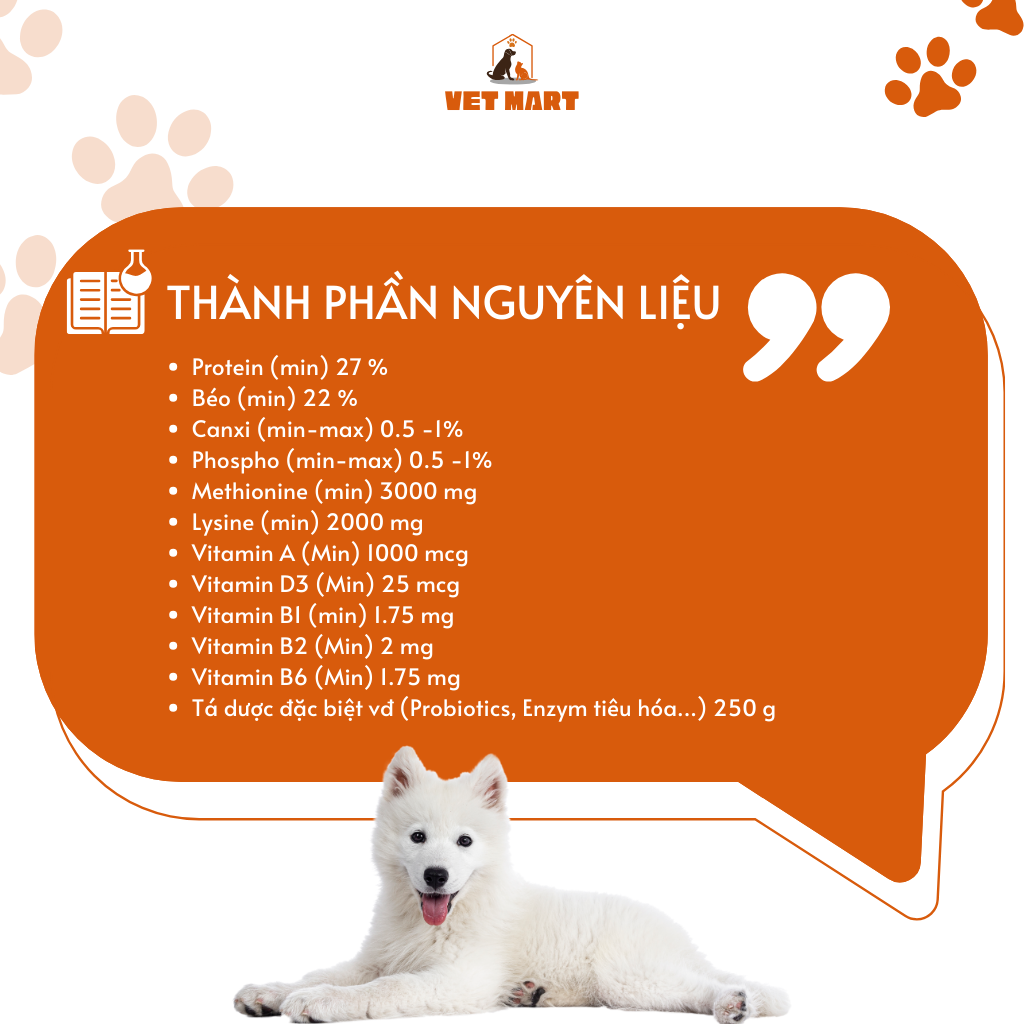 - Thức ăn bổ sung protein, béo, khoáng, axit min. ️THÀNH PHẦN: Protein (min) 27 % Béo (min) 22 % Canxi (min-max) 0.5 -1% Phospho (min-max) 0.5 -1% Methionine (min) 3000 mg Lysine (min) 2000 mg Vitamin A (Min) 1000 mcg Vitamin D3 (Min) 25 mcg Vitamin B1 (min) 1.75 mg Vitamin B2 (Min) 2 mg Vitamin B6 (Min) 1.75 mg Tá dược đặc biệt vđ (Probiotics, Enzym tiêu hóa...) 250 g ️CÁCH DÙNG VÀ LIỀU LƯỢNG: Sử dụng muỗng có sẵn trong túi để đong sữa (1 muỗng gạt tương đương 5g sữa). Dùng nước ấm khoảng 40°C-50°C để pha sữa. -Chó, mèo con dưới 1 tháng tuổi: Mỗi lần ăn, hòa 1 muỗng sữa bột vào 15ml nước ấm, cho bú hoặc để tự ăn. Có thể cho ăn 4-6 lần trong 1 ngày. -Chó, mèo từ 1-2 tháng tuổi: Mỗi lần ăn, hòa 2 muỗng sữa bột vào 30ml nước ấm, để tự ăn. Có thể cho ăn 3-4 lần trong 1 ngày. -Chó, mèo trên 2 tháng tuổi: Ngoài thức ăn thông thường, cho ăn thêm 1 muỗng sữa bột/kgP/ngày bằng cách hòa vào nước ấm hoặc trộn thức ăn. -Chó, mèo ốm, còi cọc, mang thai: Ngoài thức ăn thông thường, cho ăn thêm 2 muỗng sữa bột/kgP/ngày bằng cách hòa vào nước ấm hoặc trộn thức ăn. BẢO QUẢN: Nơi khô ráo, thoáng mát, nhiệt độ < 30°C. -Túi đã mở, sau khi dùng xong kéo khoá zipper, bảo quản được 3 tháng trong ngăn mát tủ lạnh. -Sữa đã pha bảo quản trong ngăn mát tủ lạnh được 24h. Khi sử dụng, để sữa hết lạnh rồi mới cho bú. -Không sử dụng sữa đã pha quá 24h. CAM KẾT: