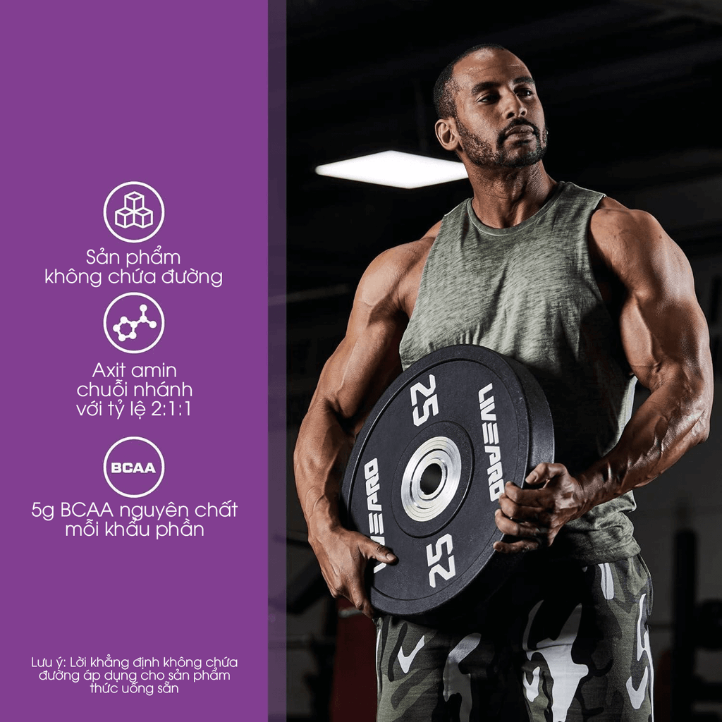 - Cung cấp 5g BCAA mỗi khẩu phần với tỷ lệ 2:1:1 tối ưu giữa Leucine, Isoleucine và Valine, giúp kích thích tổng hợp protein và phát triển cơ bắp hiệu quả