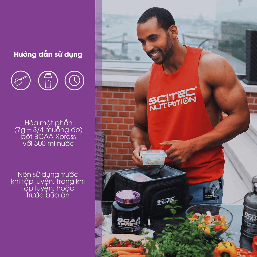 - Những người muốn nâng cao hiệu suất tập luyện tổng thể: Dù mục tiêu của bạn là tăng cơ, tăng sức mạnh, cải thiện thành tích thể thao hay giảm mỡ, BCAA đều đóng vai trò hỗ trợ quan trọng. Nếu bạn muốn buổi tập có chất lượng cao hơn (ít mệt mỏi, tập hăng hái hơn) và sau tập hồi phục tốt hơn, thì việc bổ sung một khẩu phần BCAA Xpress vào thời điểm phù hợp có thể mang lại khác biệt đáng kể. Nhìn chung, BCAA Xpress phù hợp cho hầu hết những ai tập luyện nghiêm túc và muốn tối ưu dinh dưỡng quanh buổi tập. Đặc biệt, những người có chế độ ăn hạn chế (ít đạm, ăn chay) hoặc lịch tập nặng sẽ hưởng lợi nhiều nhất từ sản phẩm này. Tuy nhiên, ngay cả người tập trung bình cũng có thể dùng BCAA để nâng cao trải nghiệm tập luyện nếu có điều kiện. Hướng dẫn cách dùng BCAA hiệu quả theo thời điểm tập luyện Để BCAA phát huy tối đa tác dụng, bạn cần sử dụng đúng liều lượng và thời điểm. Dưới đây là hướng dẫn cách dùng Scitec BCAA Xpress hiệu quả theo từng thời điểm quanh buổi tập luyện: