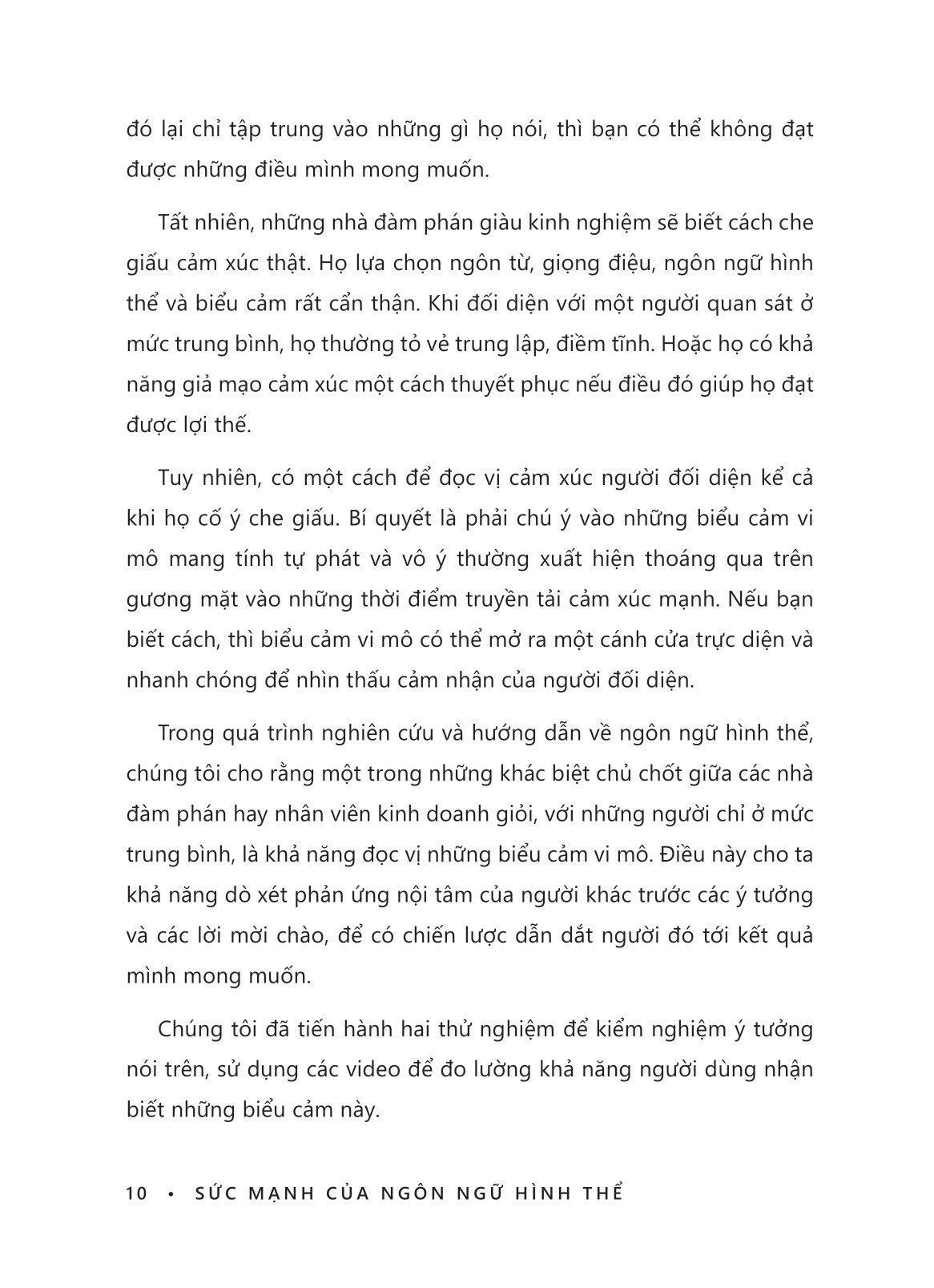 Cuốn sách này bao gồm các tín hiệu phi ngôn từ, từng hành động bình thường nhưng mang ẩn ý, tùy theo từng trường hợp mà bạn có thể dựa vào những hướng dẫn để nắm bắt chính xác cảm xúc và ý định của đối phương. Tuy nhiên, nếu chỉ giải mã tín hiệu thôi là chưa đủ, bạn cần biết m.ình nên phản ứng ra sao một khi đã hiểu được ý nghĩa hành vi của người đối diện, để làm chủ cuộc trò chuyện và đạt được lợi thế giao tiếp.