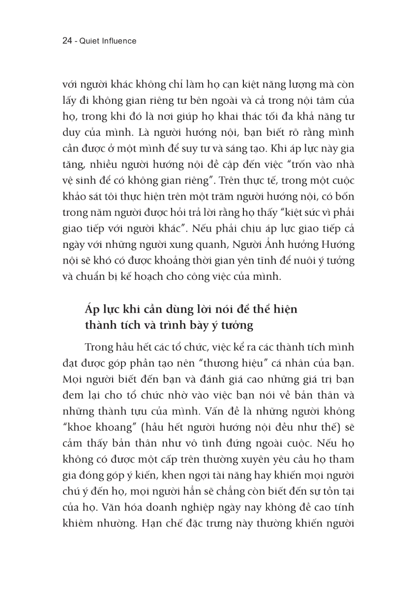 Sức Mạnh Của Sự Trầm Lắng - The Introvert's Guide To Making A Difference “Những người hướng nội, trong đó có bạn, chiếm khoảng năm mươi phần trăm dân số thế giới, và bạn hoàn toàn có thể tạo ra sự khác biệt lớn lao cho thế giới này.” Khác với những tựa sách cùng chủ đề, “Sức mạnh của sự trầm lắng” không định hướng người hướng nội thay đổi để thích nghi với thế giới dường như chủ yếu dành cho người hướng ngoại. Thay vào đó, cuốn sách sẽ giúp bạn - một người hướng nội - sống và tỏa sáng theo cách riêng của mình. Không ít người hướng nội đang gồng mình để trở thành những người trông-có-vẻ năng động, hoạt náo, và giỏi quảng giao, sống theo kiểu của người hướng ngoại. Khi chỉ còn một mình, rất nhiều người trong số ấy cảm thấy như kiệt sức sau những “vai diễn” của mình ở chốn công sở, ngoài xã hội, trước mặt bạn bè, thậm chí là người thân. Cũng bởi chúng ta đang sống trong thời đại mà “mọi người vẫn tin rằng phải khoa trương ầm ĩ mới có thể làm nên điều khác biệt”, rất nhiều người hướng nội như bạn đang cố nhào nặn chính mình để sống theo “lý tưởng hướng ngoại”. Bạn đã không biết rằng với thế mạnh trầm tĩnh bẩm sinh của mình, bạn hoàn toàn có thể vừa phát triển sự nghiệp theo định hướng của bản thân, vừa tạo nên những tác động tích cực đến những người xung quanh, và quan trọng nhất là sống thật với cảm xúc, tự do là chính mình giữa thế giới dường như ưa chuộng sự hướng ngoại. Trong “Sức mạnh của sự trầm lắng” (tựa gốc “Quiet Influence: The Introvert's Guide to Making a Difference”), tác giả của cuốn sách, tiến sĩ Jennifer Kahnweiler, giúp người hướng nội nhận diện sáu thế mạnh của mình, bao gồm: Dành thời gian để tĩnh lắng, Chuẩn bị, Lắng nghe thấu đáo, Trao đổi có trọng tâm, Viết lách, và Sử dụng mạng xã hội một cách cẩn trọng. Với mỗi thế mạnh, tiến sĩ Kahnweiler đều phân tích cụ thể, giúp người đọc có cái nhìn mạch lạc và thiết thực vào từng thế mạnh, nhờ đó mà độc giả có thể dễ dàng nắm bắt và biết cách áp dụng mỗi thế mạnh vào thực tế cuộc sống của mình để trở thành Người Ảnh hưởng Hướng nội - tức những người hướng nội có tầm ảnh hưởng tới mọi người xung quanh. Một điểm thú vị của cuốn sách là ở mỗi thế mạnh, sau khi chia sẻ vai trò cách làm thế nào để thế mạnh giúp bạn tạo ảnh hưởng, và các bước cần làm để phát huy thế mạnh đó, tác giả đều khuyến cáo về việc lạm dụng thế mạnh. Chẳng hạn như lạm dụng thế mạnh Lắng nghe thấu đáo có thể khiến bạn tự đánh mất uy thế của bản thân, hay Dành thời gian để tĩnh lắng quá nhiều là yếu tố khiến động lực bị giảm sút…. Thông qua đó, cuốn sách giúp người hướng nội hiểu thấu đáo hơn về mỗi thế mạnh, liên hệ với thực tế của mình và từ đó tìm ra cách phối hợp cân đối các thế mạnh đó. Không dừng lại ở việc chia sẻ kiến thức, tác giả còn đưa ra nhiều câu chuyện thực tế về những Người Ảnh hưởng Hướng nội. Điều này không chỉ làm cho nội dung sách trở nên thú vị và thuyết phục hơn, mà cuốn sách còn truyền động lực cho các độc giả hướng nội khi họ được chia sẻ những câu chuyện và kinh nghiệm của  những người hướng nội có sức ảnh hưởng trong mọi lĩnh vực. Độc giả còn có thể tự kiểm tra mức độ mà mình đang vận dụng sáu thế mạnh để có sự điều chỉnh cho phù hợp thông qua một công cụ được tác giả gọi là “Bài kiểm tra Chỉ số ảnh hưởng thầm lặng”. Bài kiểm tra này còn có thể được sử dụng sau khi bạn đọc áp dụng những phương pháp được đề cập trong cuốn sách để đánh giá sự thay đổi. Những ý tưởng mà tác giả gửi gắm trong cuốn sách có tính thực tiễn cao, đi thẳng vào trọng tâm và dễ nắm bắt. Thông điệp mà tiến sĩ Kahnweiler đưa ra cũng rất rõ ràng, rằng “Người hướng nội có thể là những người rất giỏi tạo ảnh hưởng nếu họ biết tận dụng tối đa những thế mạnh bẩm sinh của mình thay vì cố bắt chước cách hành xử của người hướng ngoại”. Là một cuốn sách viết về người hướng nội nhưng “Sức mạnh của sự trầm lắng” lại dành cho cả người hướng ngoại để thấu hiểu rằng, khi những người hướng nội im lặng không phải vì họ vô tâm, mà là vì họ đang hành xử kín đáo, quan tâm theo cách riêng của mình; khi họ “trốn” một mình ở một góc nào đó không phải vì họ không muốn hòa hợp với mọi người, mà đơn giản vì họ cần một khoảng không gian riêng tư để nạp lại năng lượng… Họ - những người hướng nội đang ở quanh bạn - cũng có những áp lực, vui buồn, những cung bậc cảm xúc giống như bạn, chỉ là họ có cách bộc lộ riêng và đang đợi bạn khám phá thông qua cuốn sách này. Người nổi tiếng nói gì về cuốn sách “Một cuốn sách đặc bi