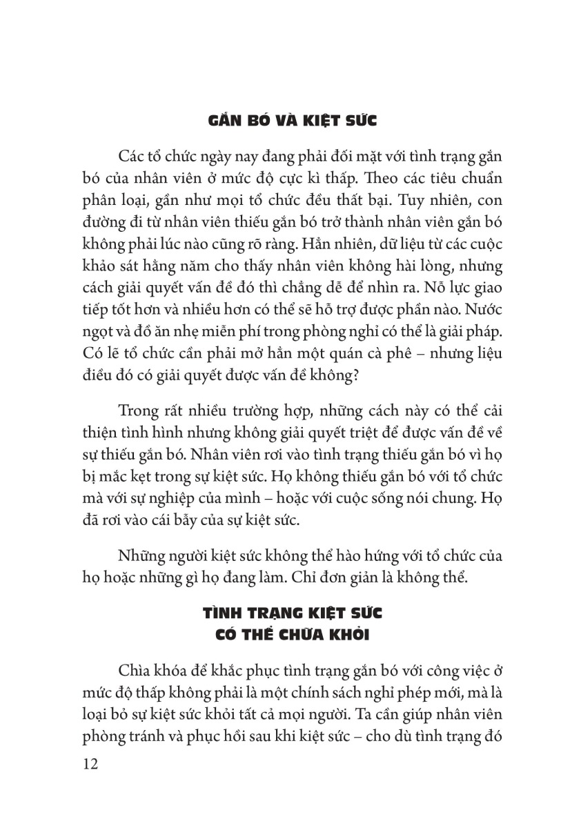 Chìa khóa để khắc phục tfnh trạng gắn bó với công việc ở mức độ thấp không phải là một chính sách nghỉ phép mới, mà là loại bỏ sự kiệt sức khỏi tất cả mọi người. Ta cần giúp nhân viên phòng tránh và phục hồi sau khi kiệt sức, cho dù tình trạng đó xuất phát từ nơi làm việc, gia đình hay cộng đồng. Sự kiệt sức len lỏi từ khía cạnh này sang khía cạnh khác trong cuộc sống của họ, ngay cả khi nó không bắt nguồn từ công việc, ta vẫn cảm nhận được tác động của nó đến năng suất lao động.