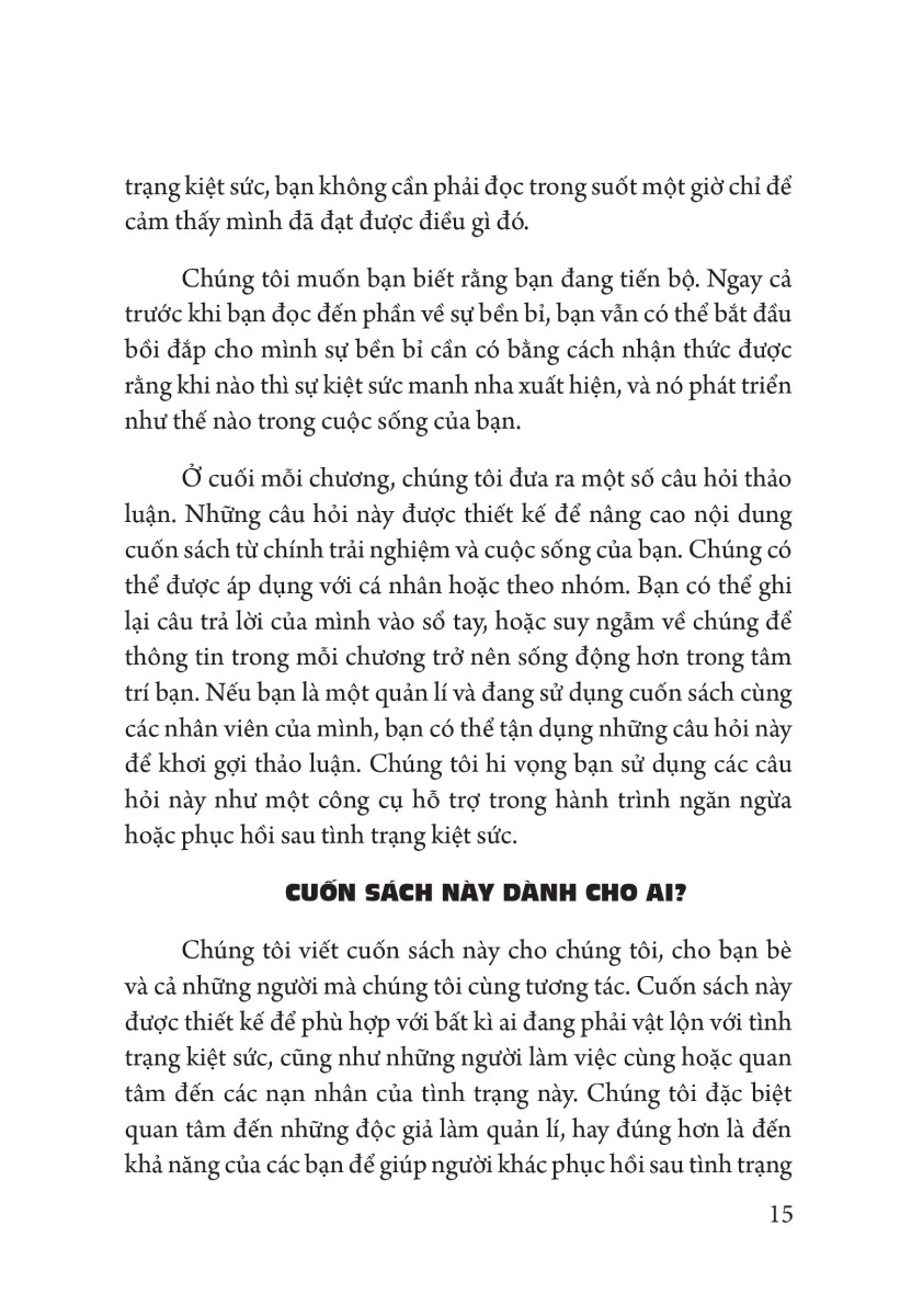 Nếu bạn là một chuyên gia trong lĩnh vực nhân sự, cuốn sách này sẽ giúp bạn thấy rõ hơn về những con đường dẫn đến tình trạng kiệt sức. Dù bạn là nhân viên, người mẹ, người cha, người vợ, người chồng, người con hoặc là bất cứ ai, bạn vẫn hiểu được cuốn sách này