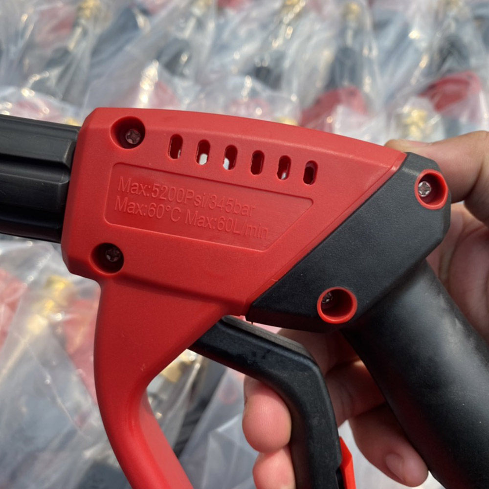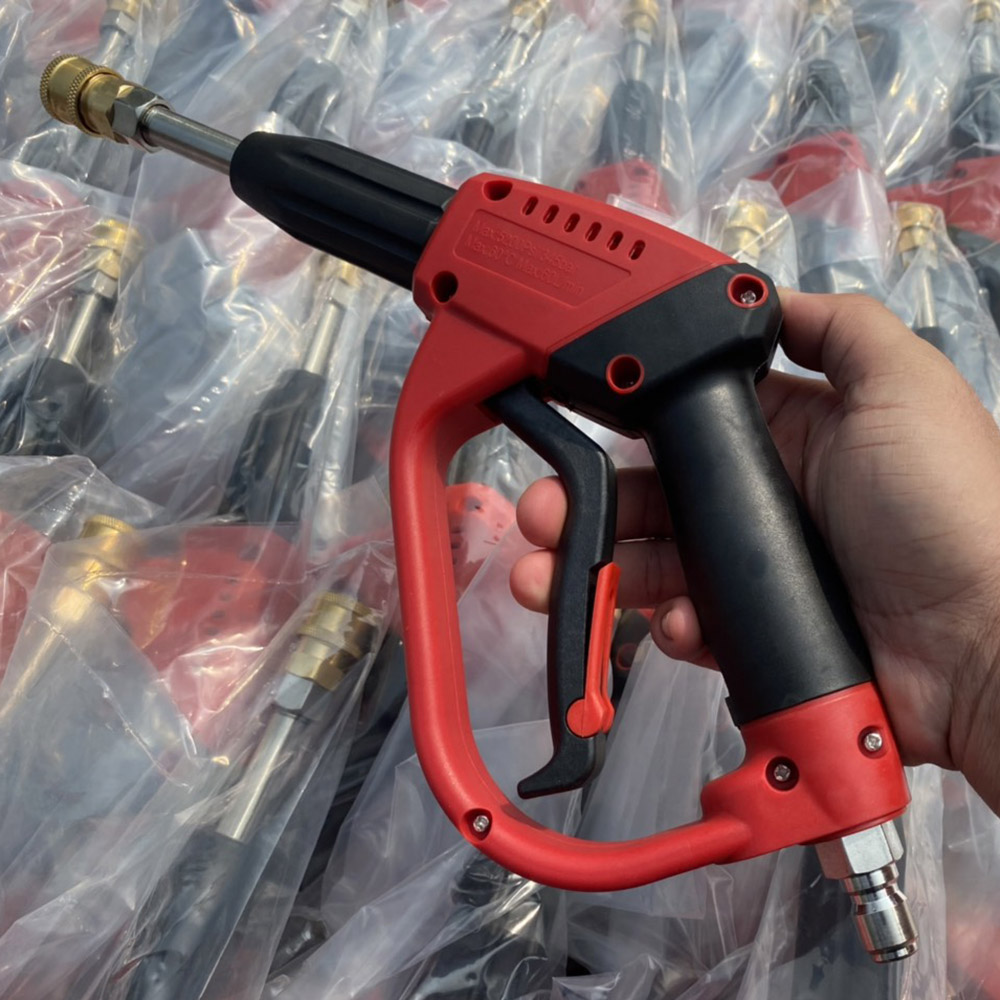 - Báng súng rửa xe cao áp đỏ ngắn gồm cò súng và đầu kết nối với dây cao áp, báng súng được thiết kế vừa với khung tay của người thợ.