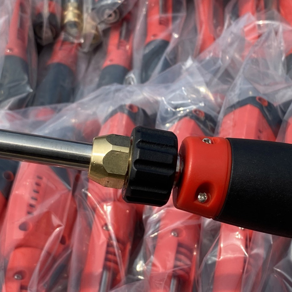 - Các khớp nối được làm bằng đồng giúp tăng tuổi thọ của súng rửa xe cao áp đỏ dài.