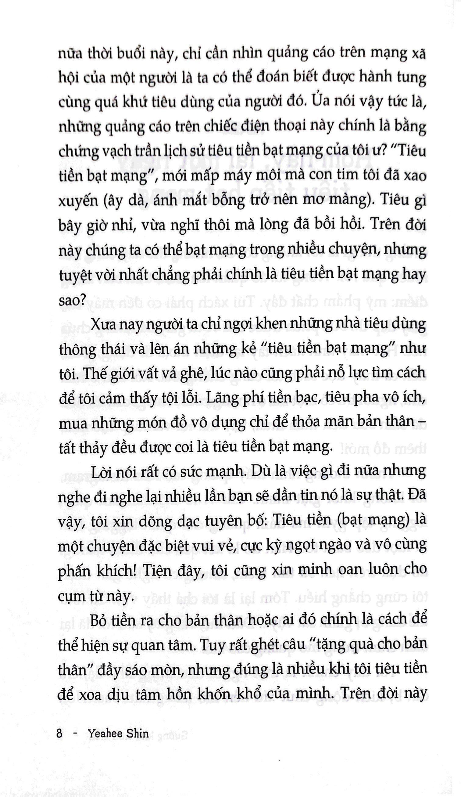 Sướng khổ tiêu tiền. Trong cuốn sách này, tác giả Yeahee Shin đưa ra một chân lý vĩnh hằng: "Cứ ai đi đừng sợ!". Dám thử sám sai, bạn mới tìm được "chân ái" của đời m.ì giống như tác giả: robot lau nhà, quần áo xếp ly, apps đặt đồ ăn và đi chợ hộ,