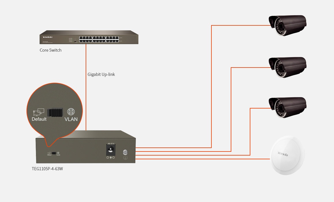 VLAN: cổng 1-4 sẽ được cô lập với nhau, nhưng có thể kết nối với cổng 5, giúp chặn broadcast storm và bảo vệ DHCP spoofing。