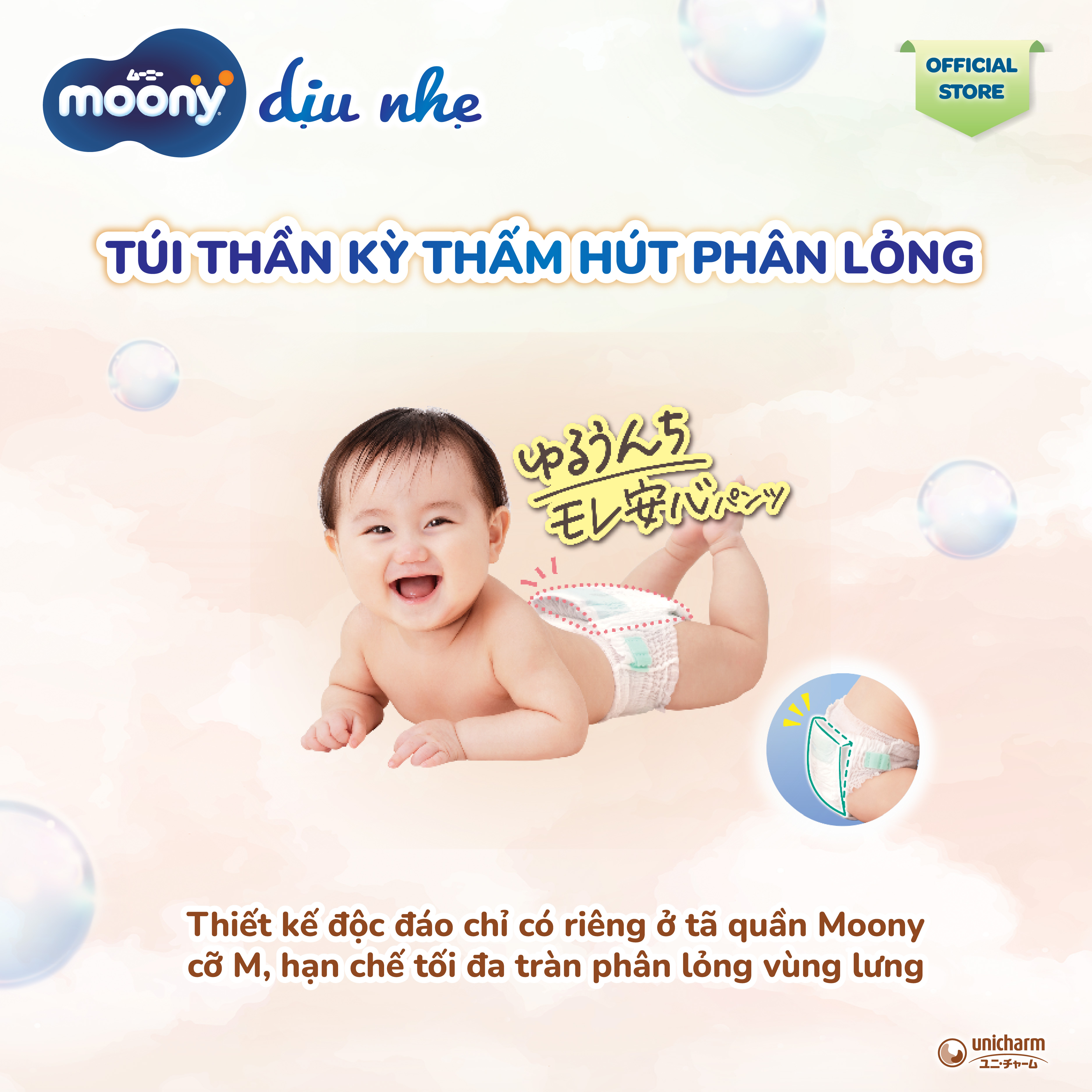 - Công nghệ ngăn tràn ĐỘC QUYỀN, chỉ có riêng ở tã quần Moony Dịu Nhẹ (size M): Túi thần kỳ thấm hút phân lỏng, hạn chế tối đa tràn phân lỏng vùng lưng