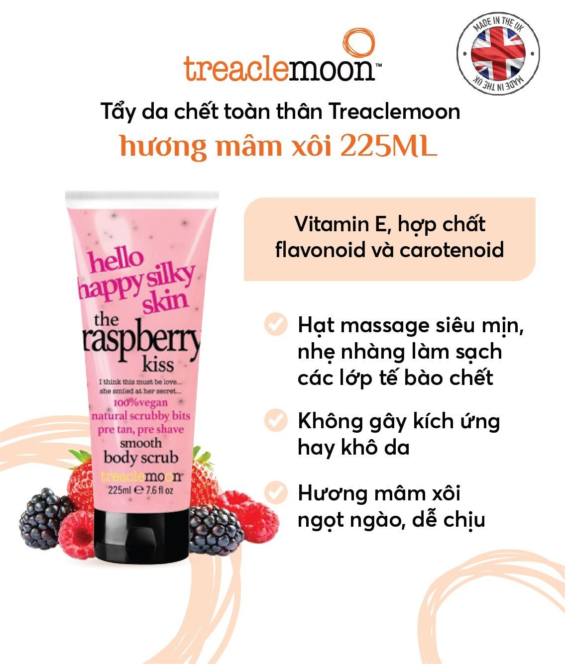 Gel tẩy da chết toàn thân với thành phần chiết xuất phúc bồn tử và sáp Jojoba nhẹ nhàng làm sạch các lớp tế bào chết và cặn bã trên da, cho làn da mịn mượt mềm mại tức thì. Hương thơm nồng nàn lãng mạn của trái dâu rừng còn lưu lại trên da suốt cả ngày. Sản phẩm dạng gel chứa nhiều hạt massage tiện lợi sử dụng trong phòng tắm và cho bạn cảm giác thực sự thư giãn.
