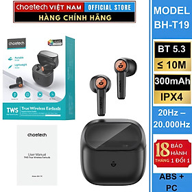 - Đóng gói: Hộp 1 sản phẩm, 1 cáp sạc USB A to Type C và hướng dẫn sử dụng Thông tin chi tiết Kết nối ổn định – Bluetooth 5.3 – Với công nghệ Bluetooth 5.3 tiên tiến, tai nghe đảm bảo kết nối nhanh, ổn định với các thiết bị Android, iOS, laptop… mà vẫn tiết kiệm năng lượng hiệu quả. Trải nghiệm không dây hoàn toàn mượt mà, độ trễ thấp, lý tưởng cả khi chơi game hay họp trực tuyến. Chuẩn Bluetooth mới này còn cho phép người dùng dễ dàng ghép nối được với hầu hết các thiết bị smartphone, laptop, tablet hiện nay và trải nghiệm âm thanh mượt mà trong phạm vi kết nối lên đến 10m. Thiết kế True Wireless hiện đại – Gọn nhẹ, tiện dụng – BH-T19 mang kiểu dáng nhỏ gọn, thiết kế công thái học giúp đeo thoải mái trong thời gian dài mà không gây cấn tai. Hộp sạc cũng được thiết kế tối giản, dễ dàng bỏ túi – thích hợp với những người thường xuyên di chuyển. Âm thanh rõ nét – Trải nghiệm sống động – Choetech trang bị cho BH-T19 driver âm thanh chất lượng cao, mang đến dải âm cân bằng, âm bass tròn đầy và âm treble rõ ràng – lý tưởng cho việc nghe nhạc, xem video hay gọi điện thoại. Dung lượng pin ấn tượng – Sử dụng dài lâu – Dung lượng hộp sạc: 300mAh giúp cung cấp nhiều lần sạc cho tai nghe, cho tổng thời gian sử dụng dài hơn trong ngày. Sạc nhanh qua cổng Type-C, vô cùng tiện lợi và phổ biến. Chống nước IPX4 – Linh hoạt trong mọi điều kiện, ChoetechBH-T19sở hữu khả năng kháng nước chuẩn IPX4, giúp bảo vệ tai nghe khỏi mồ hôi, nước mưa nhẹ hoặc nước văng. Cực kỳ phù hợp với người dùng yêu thích thể thao, vận động ngoài trời hoặc thường xuyên di chuyển. Hình ảnh Tai nghe Bluetooth 5.0 Choetech BH-T19 (Pin 300mAh, Chống Nước IPX4) - Hàng chính hãng