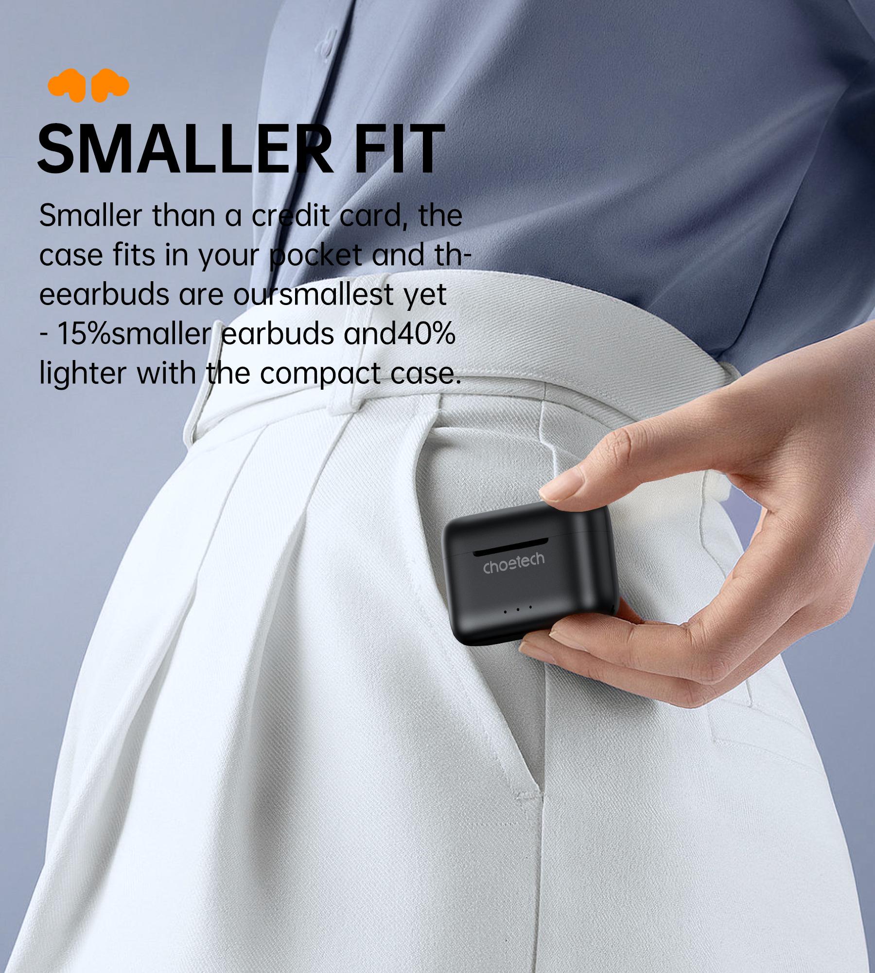 - Tai Nghe Bluetooth Chống Ồn Chủ Động Choetech BH-T15 có thiết kế rất nhỏ nhắn, có thể đeo lọt vào trong vành tai của cả những bạn có tai nhỏ nhất. Mặt ngoài của tai là những mặt cảm ứng, với đầy đủ tính năng từ chỉnh bài hát, nhận cuộc gọi, gọi trợ lý ảo, chỉnh âm lượng và bật tắt chống ồn…