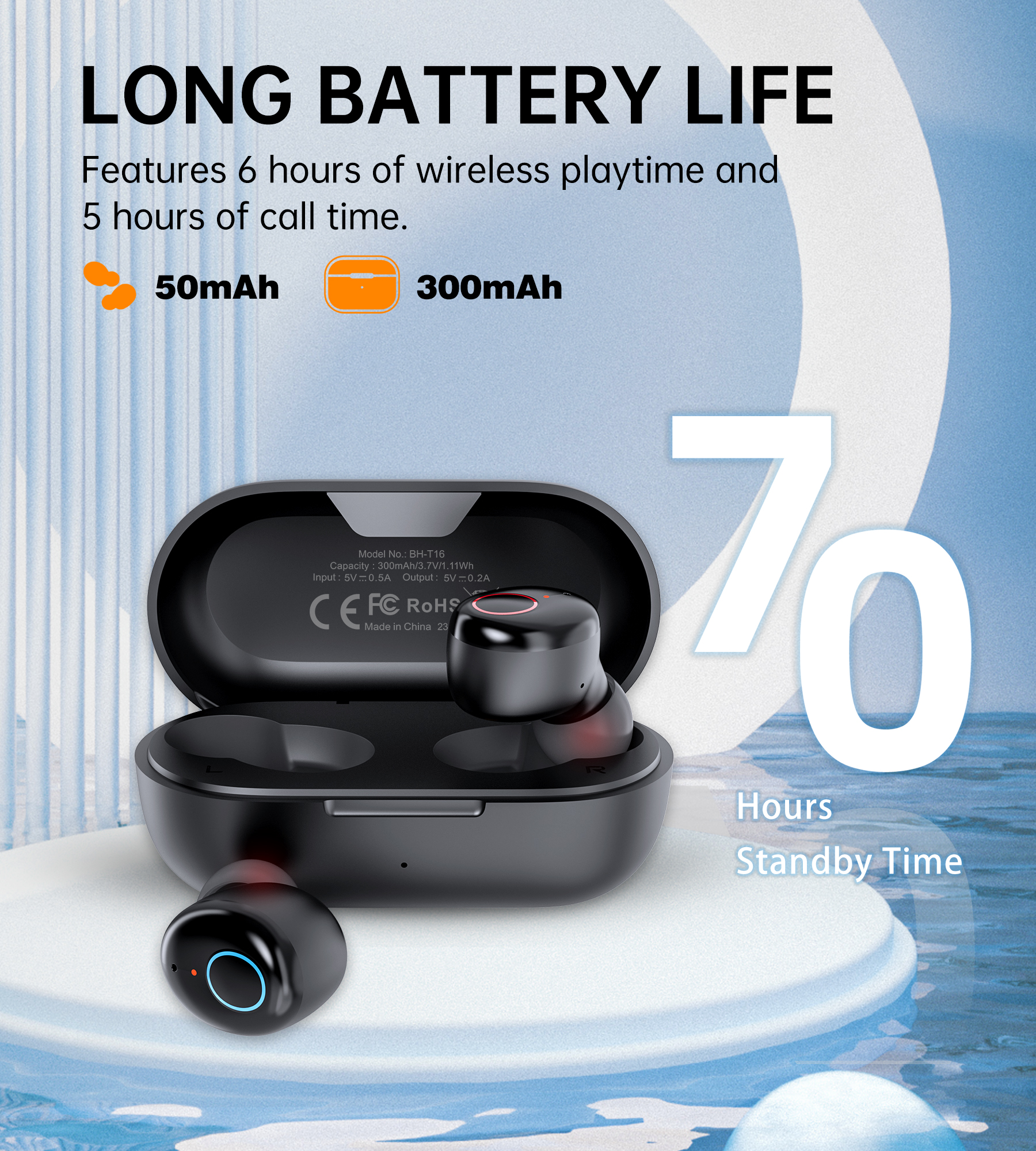 - Thương hiệu: Choetech - Model: BH-T23 - Phiên bản: V5.3 - Phạm vi kết nối: < 10M - Giao thức hỗ trợ: HFP, HSP, A2DP, AVRCP - Dải tần số: 20Hz~20KHz - Dung lượng pin ngăn sạc: 300mAh (3,7V