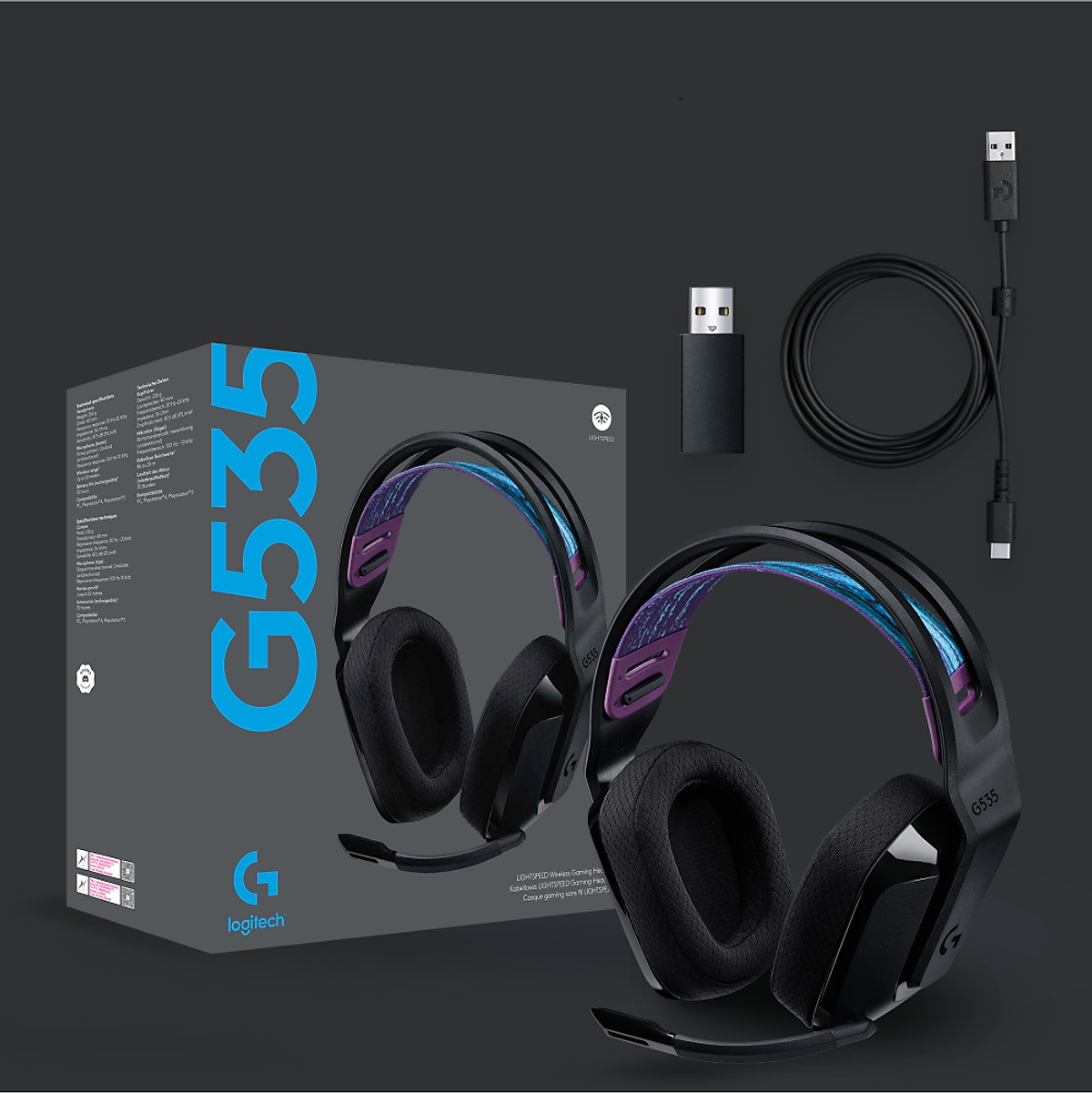 Tai nghe game không dây Lightspeed Logitech G535 - Trọng lượng nhẹ, âm thanh nổi, tương thích PC, PS4, PS5, Mic gấp để tắt tiếng Tai nghe chơi game không dây G535 đem đến cho bạn hiệu suất, sự tự do và thoải mái trong tất cả những buổi chơi game. Công nghệ LIGHTSPEED không dây tiên tiến có độ trễ thấp đem lại sự tự do không dây đáng tin cậy lên tới 12 m và thời lượng pin đáng kinh ngạc 33 giờ.(1) Màng loa 40 mm đem lại âm thanh nổi rõ ràng, trong trẻo và sâu lắng. Chỉ nặng 236 gram, quai đeo có thể điều chỉnh và chụp tai bằng cao su non mềm mại đảm bảo sự thoải mái suốt ngày. Các nút điều khiển trên tai nghe cho phép bạn nhanh chóng tăng âm lượng trò chơi hoặc âm nhạc. Chỉ cần gấp lên để tắt tiếng và giấu gọn gàng. G535 đã được chứng nhận Discord để đảm bảo đem lại hiệu suất giao tiếp rõ như pha lê với âm thanh và độ rõ ràng giọng nói tuyệt vời. - LIGHTSPEED không dây cho kết nối nâng cao, đáng tin cậy. - Thời lượng pin để chơi game là 33 giờ - Chỉ 236 gram - Thiết kế co dãn với đệm tai làm từ cao su non đem lại sự thoải mái suốt cả ngày - Điều khiển âm lượng trên tai và mic gấp-để-tắt tiếng - Màng loa 40 mm cho âm thanh nổi rõ ràng, trong trẻo - Được chứng nhận Discord cho cuộc giao tiếp rõ ràng - Hoạt động với PC và PlayStation LIGHTSPEED không dây: Công nghệ không dây LIGHTSPEED cấp độ chuyên nghiệp đem lại thời lượng pin 33 giờ (1) và sự tự do không dây đáng tin cậy lên tới 12 m Trọng lượng nhẹ và thoải mái Nặng chỉ 236 gram, G535 nhỏ và nhẹ hơn G733; quai đeo co dãn hai mặt giúp phân phối trọng lượng và có thể điều chỉnh cho độ vừa vặn tùy chỉnh Cắm vào là sử dụng được: Tối ưu hóa thời gian chơi của bạn với tai nghe chơi game dễ dùng, cắm vào là sử dụng; G535 sử dụng kết nối USB tương thích với PC và các thiết bị chơi game PlayStation Tương thích PC và máy chơi game: PlayStation 5, PlayStation 4 Điều khiển trên khung tai nghe Nút xoay âm lượng nằm trực tiếp trên khung tai nghe, để nhanh chóng tăng âm lượng trò chơi, âm nhạc hay cuộc trò chuyện của bạn; chỉ cần gấp micrô lên để tắt tiếng và cất gọn Màng loa 40 mm Với màng loa neodymium 40 mm, chiếc tai nghe chơi game không dây này đem lại âm thanh nổi rõ ràng, trong trẻo và sâu lắng, giúp cho trò chơi của bạn trở nên chân thực hơn. Thoải mái suốt ngày Chụp tai bằng cao su non thoải mái và vật liệu vải lưới thể thao lý tưởng khi sử dụng lâu dài G535 đã được chứng nhận Discord để đảm bảo đem lại hiệu suất giao tiếp rõ như pha lê với âm thanh và độ rõ ràng giọng nói tuyệt vời YÊU CẦU HỆ THỐNG: Cổng USB cho LIGHTSPEED: Windows 10, macOS X 10.14 trở lên Kết nối Internet cho Phần mềm G HUB của Logitech (2) TRONG HỘP GỒM - Tai nghe chơi game G535 - Quai đeo mềm hai mặt (đi kèm) -