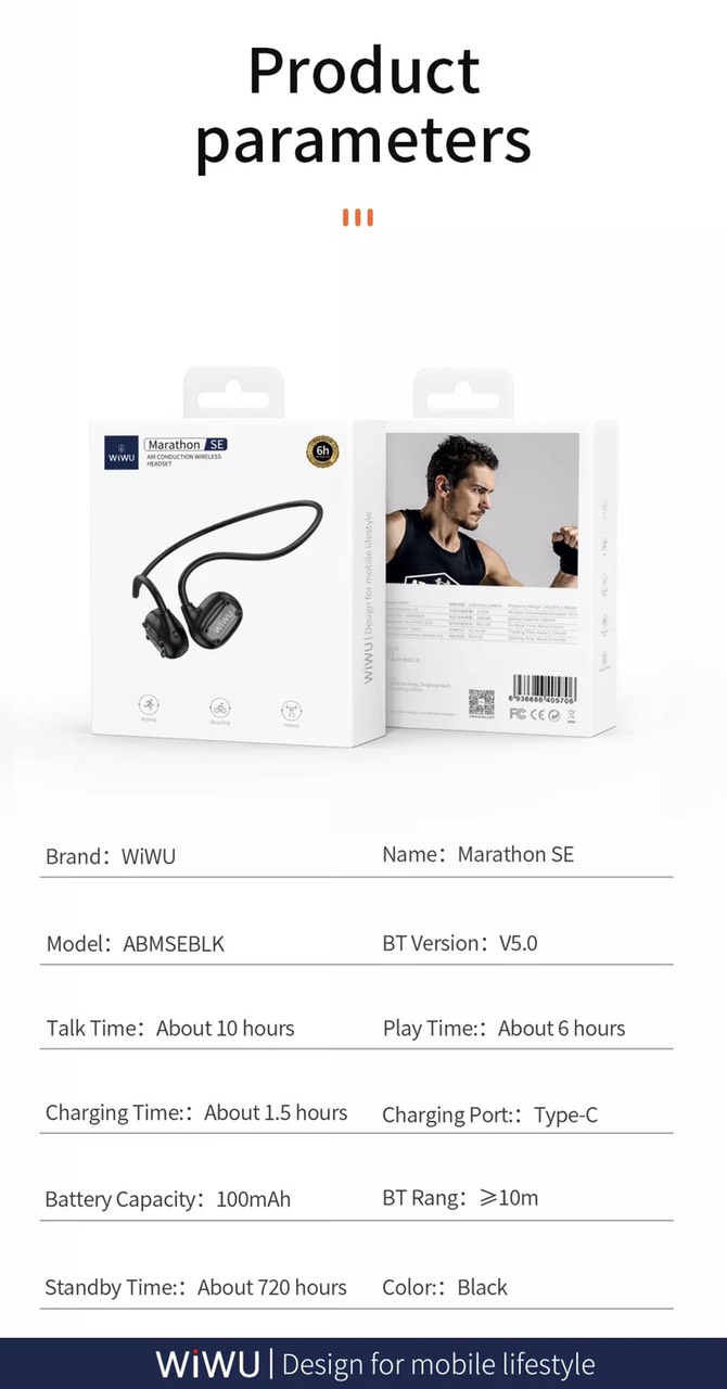 Mua tại TiktokTai nghe không dây thể thao Wiwu SE Thương hiệu: Mô tả sản phẩm Dung lượng pin: 100mAh Thời gian làm việc : khoảng 6 giờ , tiêu thụ điện năng thấp Tai nghe chỉ nặng 13g nhẹ và tương thích. Làm bằng vật liệu siêu nhẹ và thân thiện với da Uốn cong ngẫu nhiên 360 độ. Hợp kim titan, bộ xương hạng chuyên nghiệp thử thách kiểm tra lặp lại 10000 lần Công nghệ Bluetooth 5.0 mang đến chất lượng âm thanh cao Phần tử cảm biến điện dung tích hợp độ nhạy cao Thời gian sạc: khoảng 1,5 giờ Thời gian trò chuyện: khoảng 720 giờ Cổng sạc: Type-C Khoảng cách truyền: 10m