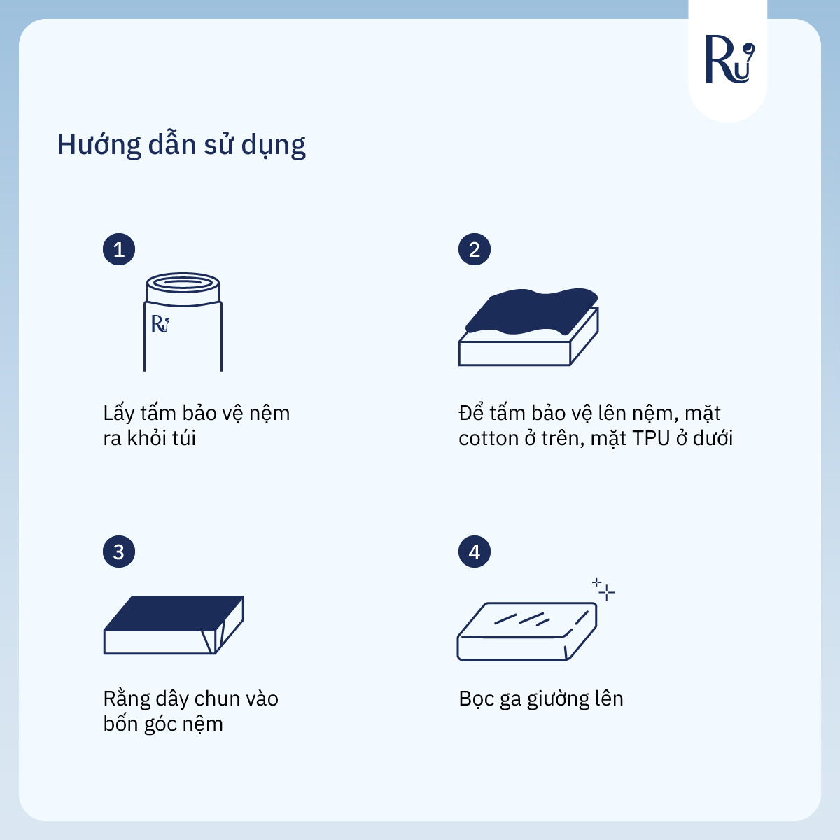 Tấm Bảo Vệ Nệm (Mattress Protector) Ru9 Chống Thấm Tuyệt Đối, Thông Thoáng - Mềm Mại | 6 Kích Thước | Nhiều Màu Sắc ---------------------------------------------------- *Chi tiết sản phẩm: Thông tin sản phẩm: Tấm Bảo Vệ Nệm Ru9 vừa hỗ trợ giữ chiếc nệm luôn sạch sẽ, vừa đảm bảo đem đến sự êm ái, dễ chịu cho giấc ngủ của bạn. Không chỉ ngăn cản làm bẩn nệm, “tấm khiên” này còn bảo vệ bạn khỏi sự lo lắng không đáng có. - Quy cách đóng gói: Sản phẩm được cuộn lại và bỏ vào túi vải nhỏ gọn và tiện lợi - Sản phẩm gồm: 1 tấm bảo vệ Ru9 và túi để đựng ---------------------------------------------------- *Hướng dẫn bảo quản: - Giặt tấm bảo vệ định kì với máy giặt để giữ vệ sinh. - Giặt ở chế độ giặt nhẹ, không sấy nóng. ---------------------------------------------------- *Hướng dẫn sử dụng: - Khi sử dụng, gỡ dây cột túi tấm bảo vệ và lấy tấm bảo vệ ra - Có thể cuộn lại và bỏ vào túi để giữ vệ sinh nếu không sử dụng - Để ở trên mặt nệm và ở dưới ga giường ---------------------------------------------------- *Lưu ý: - Tránh tiếp xúc trực tiếp với nắng gắt ---------------------------------------------------- *Cam kết với khách hàng: Miễn phí vận chuyển với đơn hàng trên 1.500.000đ ---------------------------------------------------- *Chính sách giao hàng: Giao tiêu chuẩn (trừ Chủ Nhật): - Hồ Chí Minh và Hà Nội (2 ngày) - Tỉnh (4 - 5 ngày) - Khu vực cận HCM và HN (2-3 ngày) Cần thêm thông tin và hỗ trợ