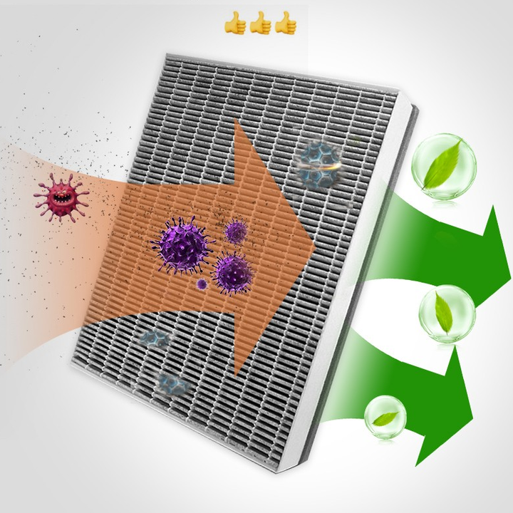 - Tấm lọc giúp giảm lượng hơi TVOC xuống còn 0.01mg/m3 trong không khí nhờ vào than dừa hoạt tính trong tấm lọc Loại bỏ hiệu quả các khí độc hại