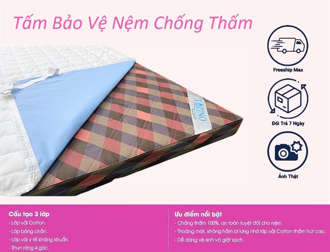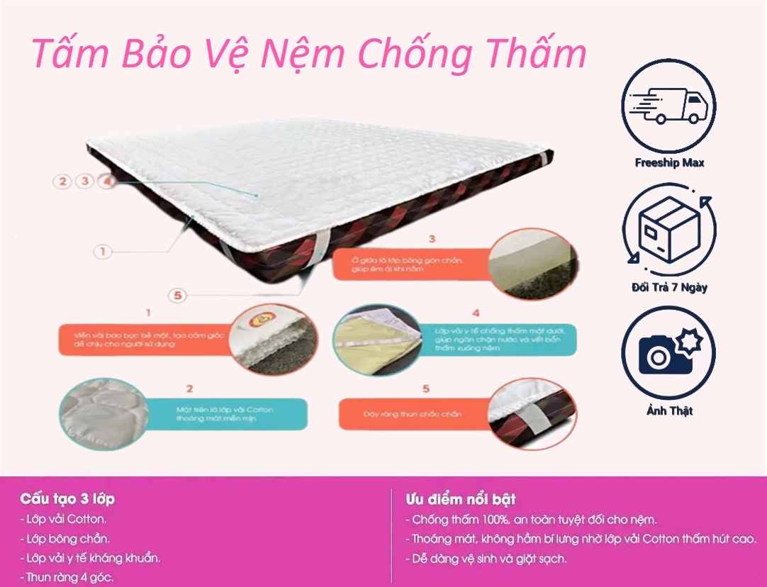 Mua tại TiktokTấm lót bảo vệ nệm chống thấm 100% giúp bạn giải quyết triệt để vấn đề nước đổ lên nệm, hay bé tè dầm, nôn ói làm nệm bị dơ và có mùi khó chịu. Rất thích hợp khi bạn vừa mua một tấm nệm mới, hoặc muốn bảo quản để nệm sử dụng được lâu dài. Cấu tạo sản phẩm